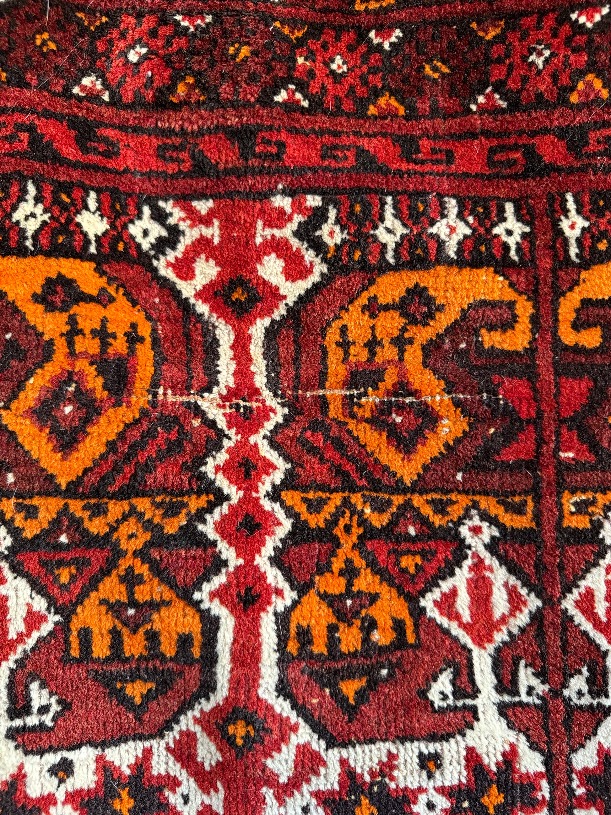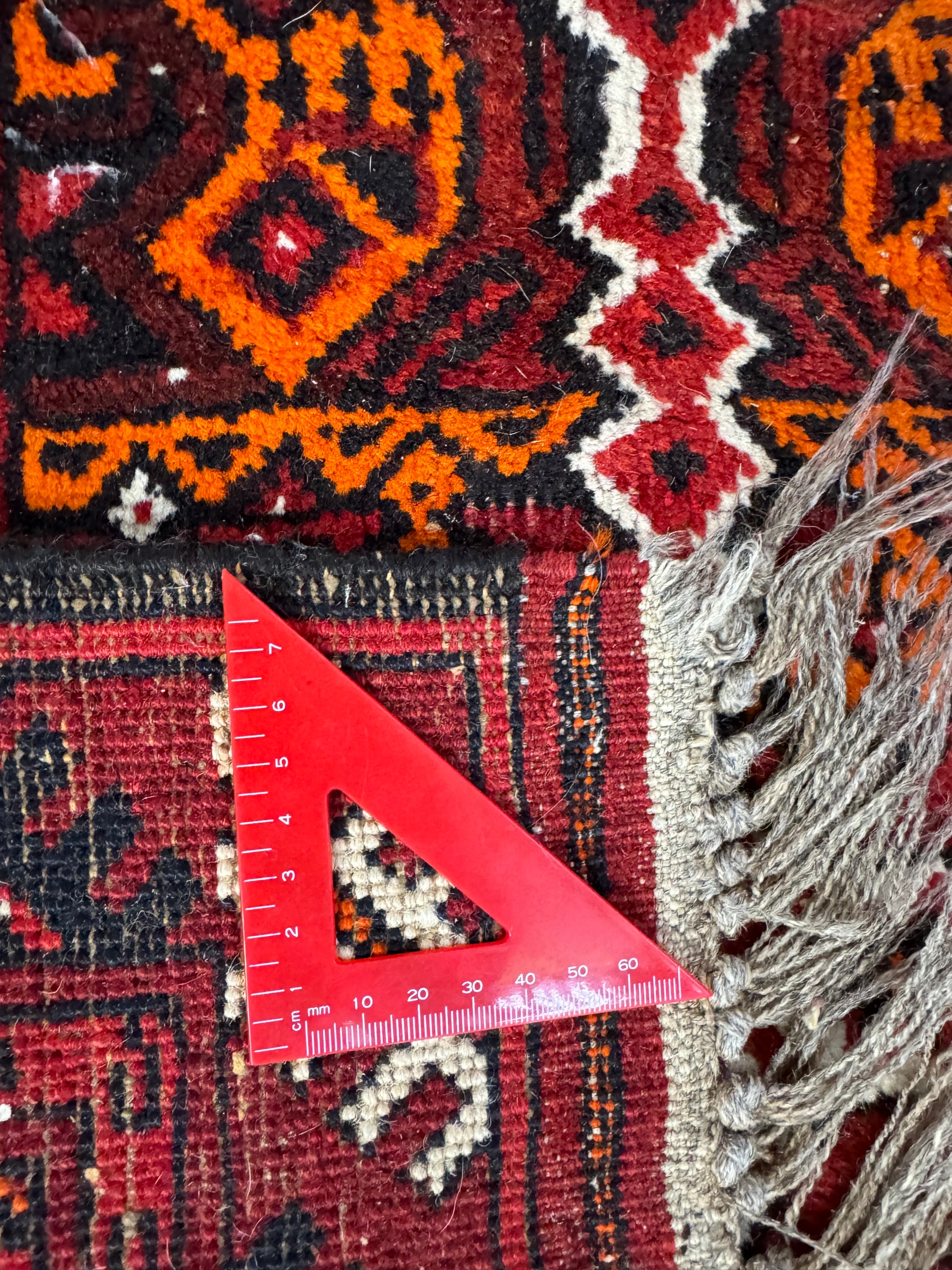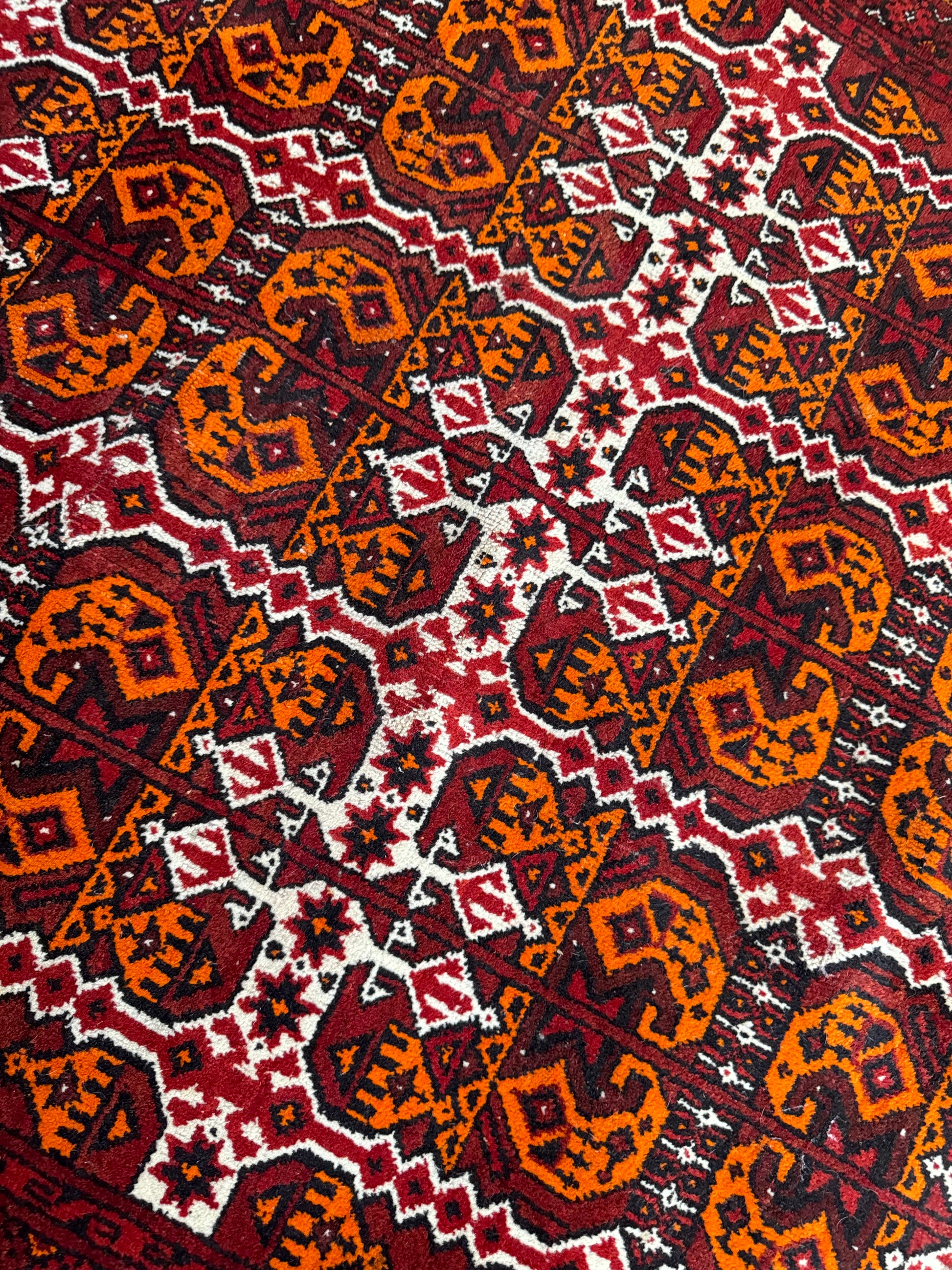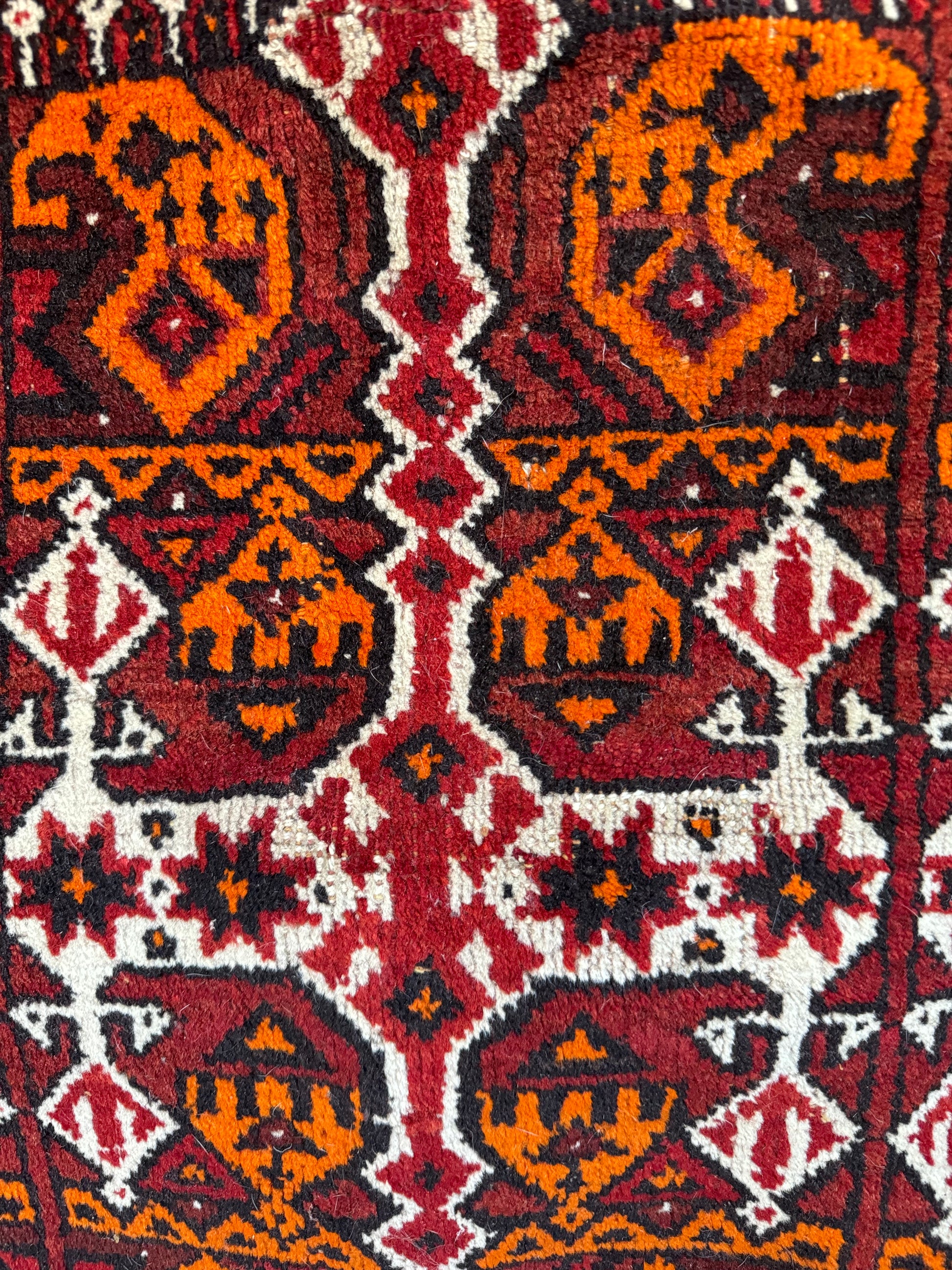 In very good vintage condition with minor age wears - showing some slight thinning of the pile. Finely knotted from wool. Dense and sturdy rug that can withstand heavy foot traffic. Love the tribal theme with bold orange and red colors on this. Rug has since been cleaned, and ready for use.