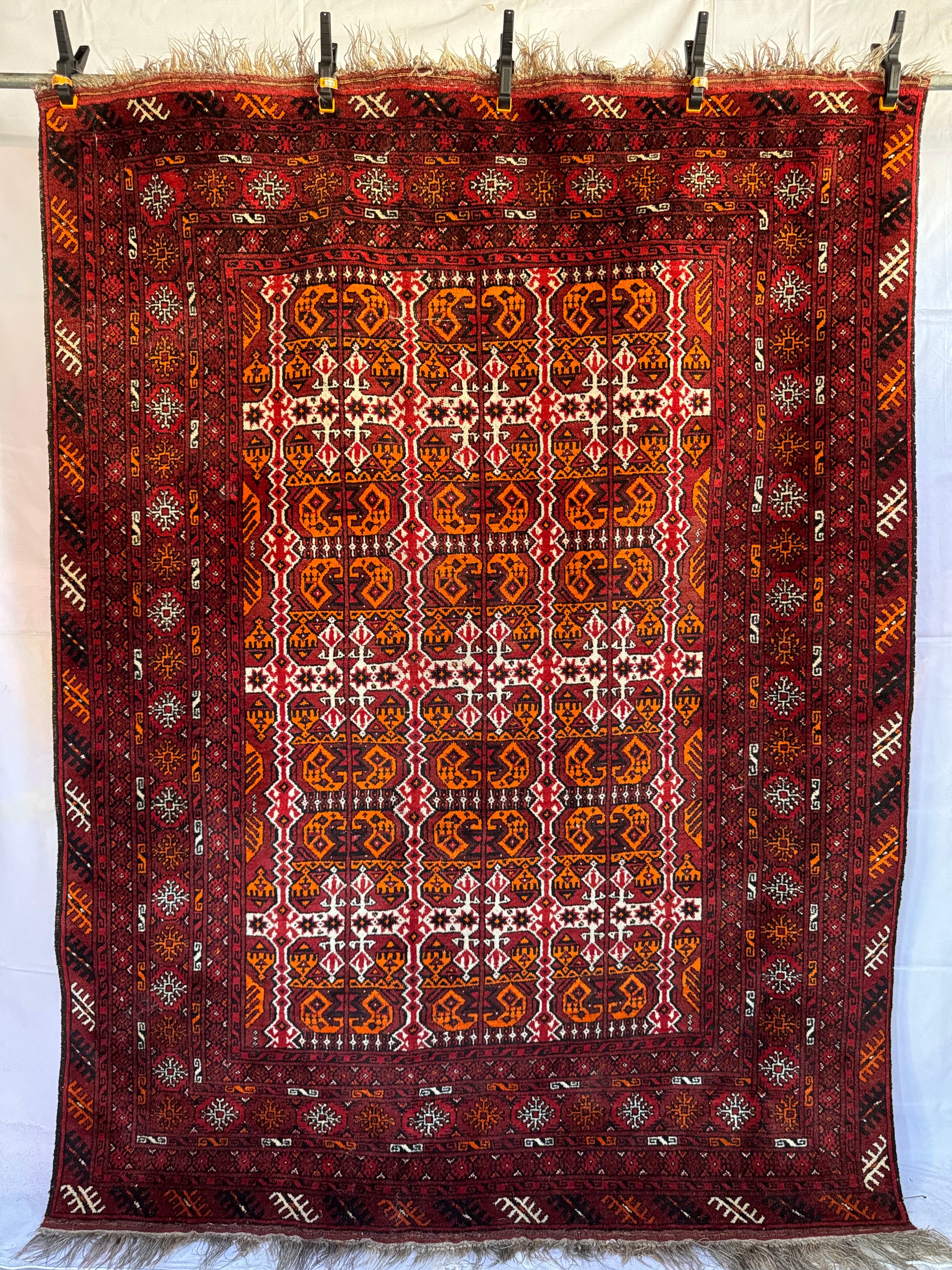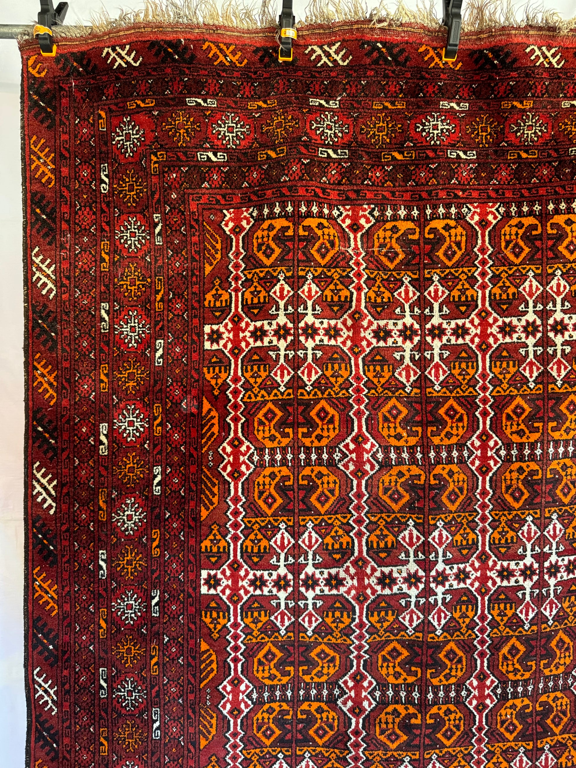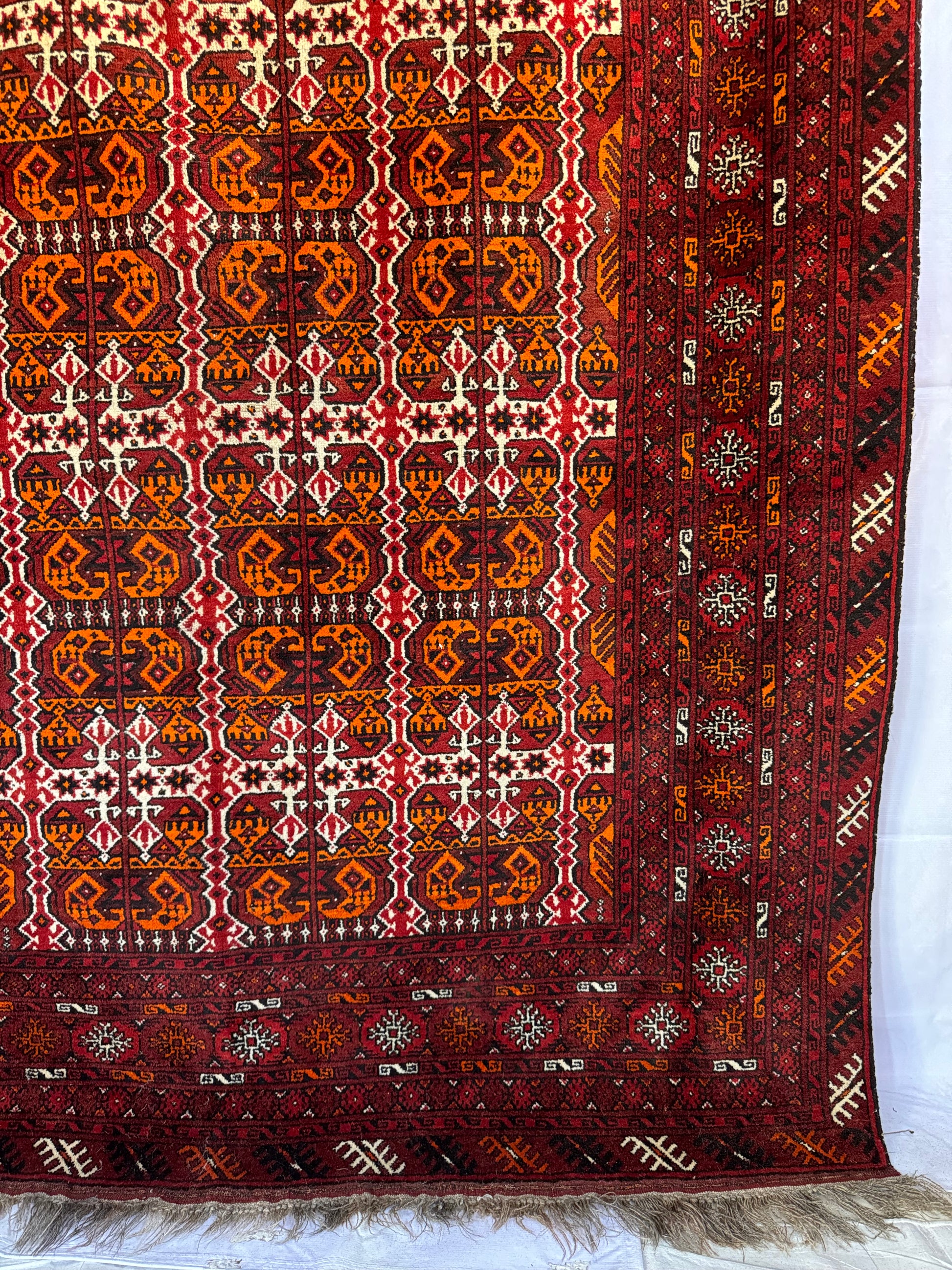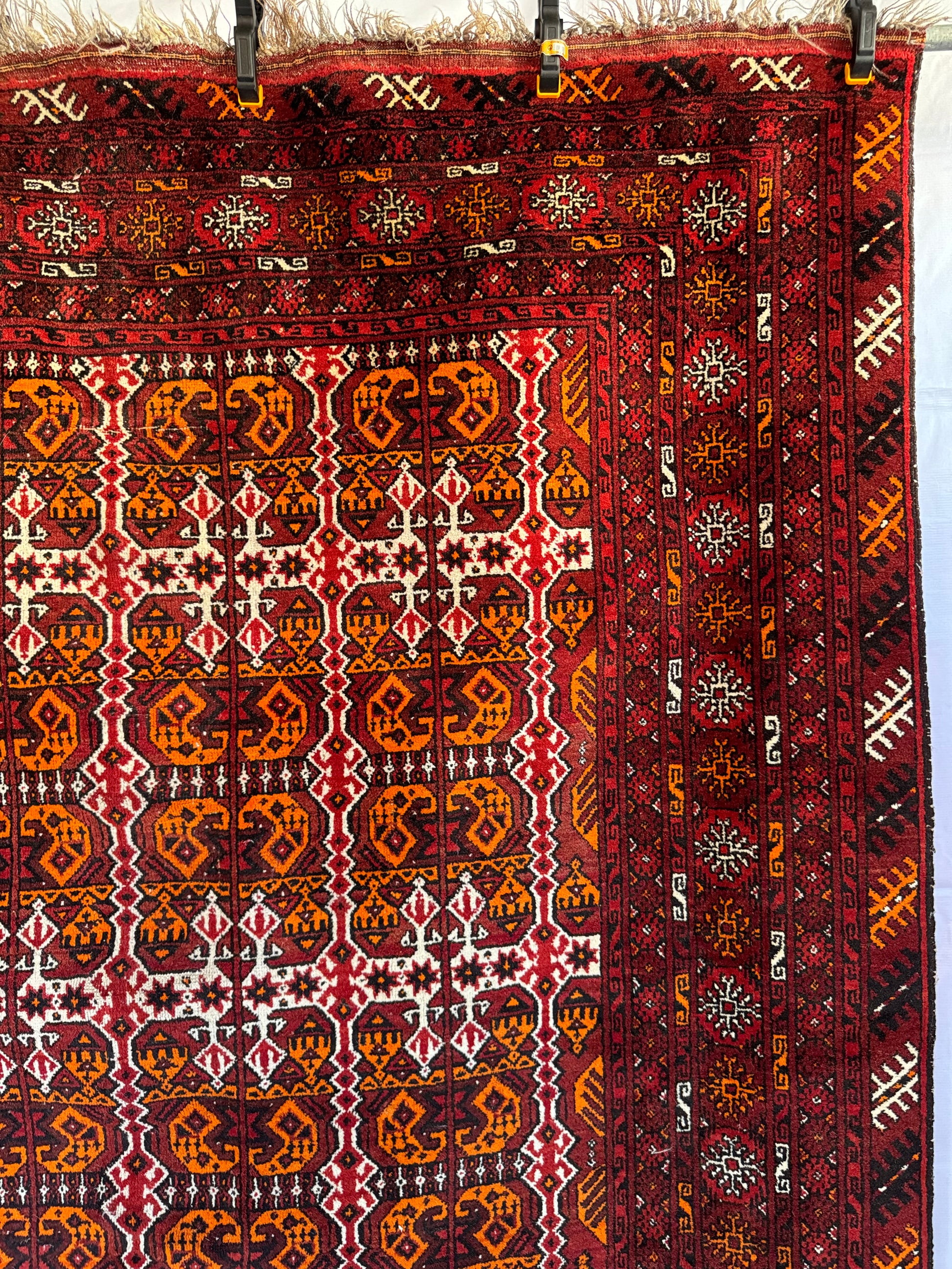 In very good vintage condition with minor age wears - showing some slight thinning of the pile. Finely knotted from wool. Dense and sturdy rug that can withstand heavy foot traffic. Love the tribal theme with bold orange and red colors on this. Rug has since been cleaned, and ready for use.
