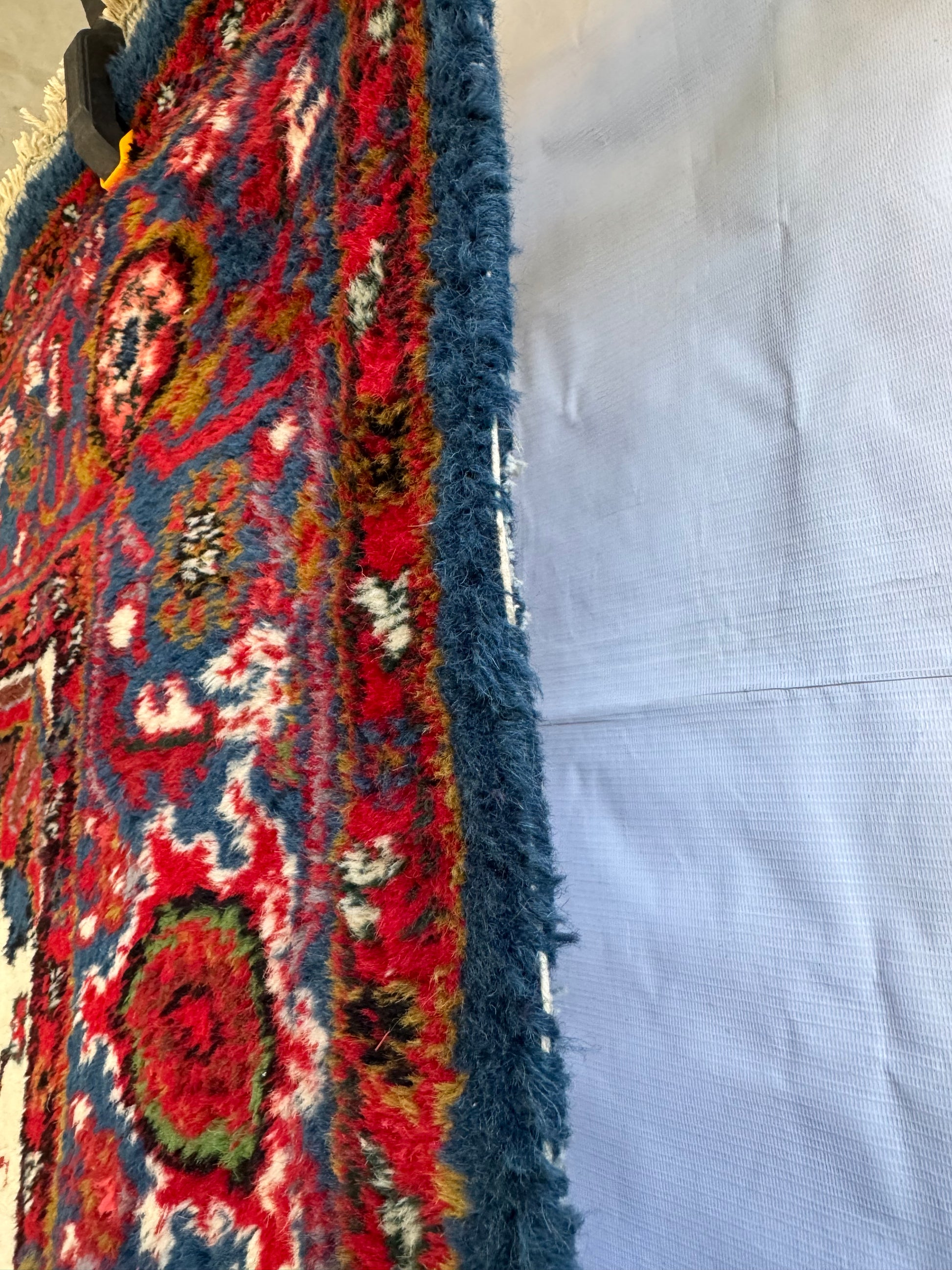In good vintage condition with age wears - multiple bald spots upon closer inspection and some minimal wear on the side bindings and fringes. Thick fluffy pile of wool with vibrant colors.