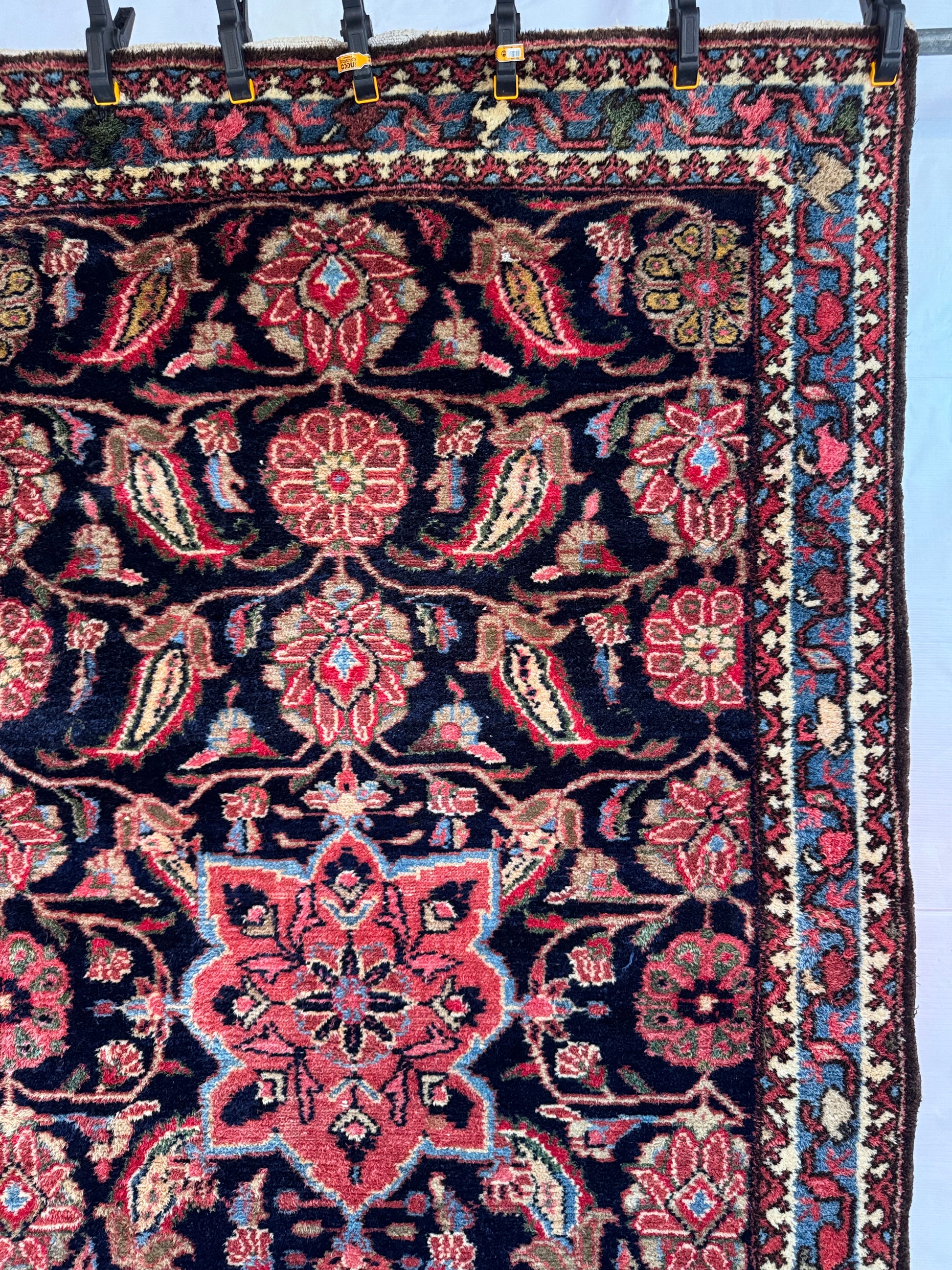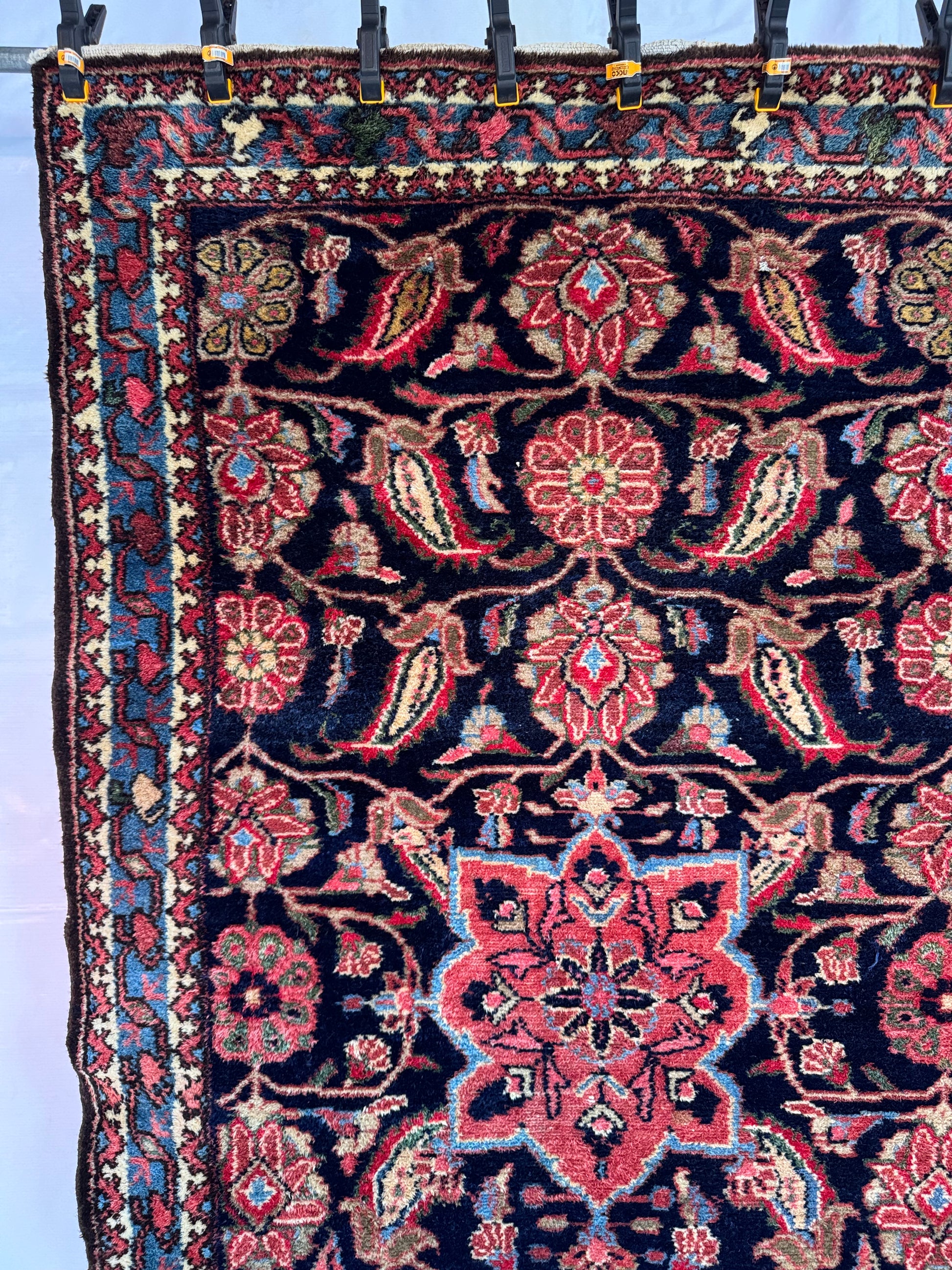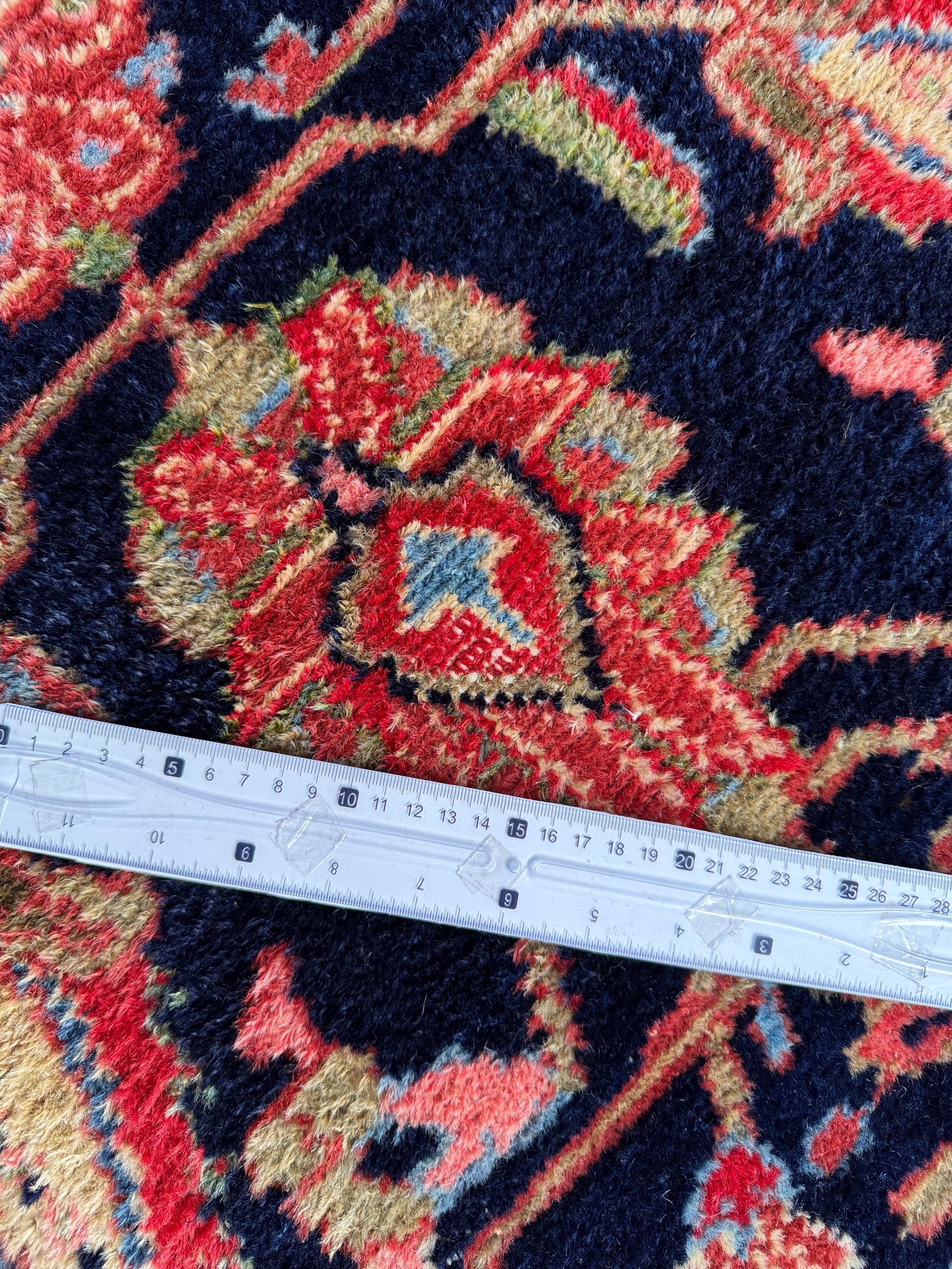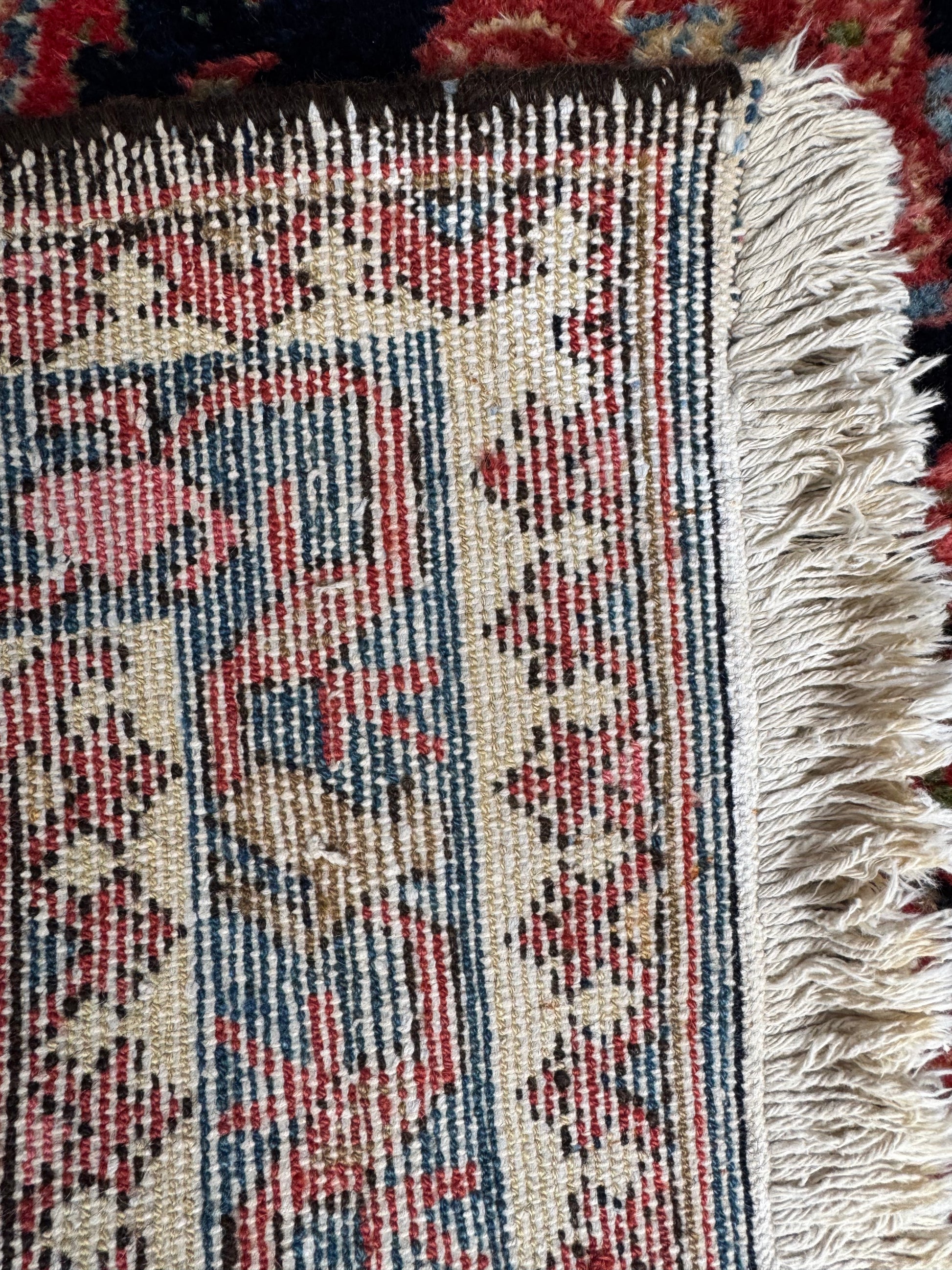 In very good vintage condition with minimal wear - small barely visible bald spot. Intact fringes and sides. Beautiful dark blue background with an all over floral pattern.