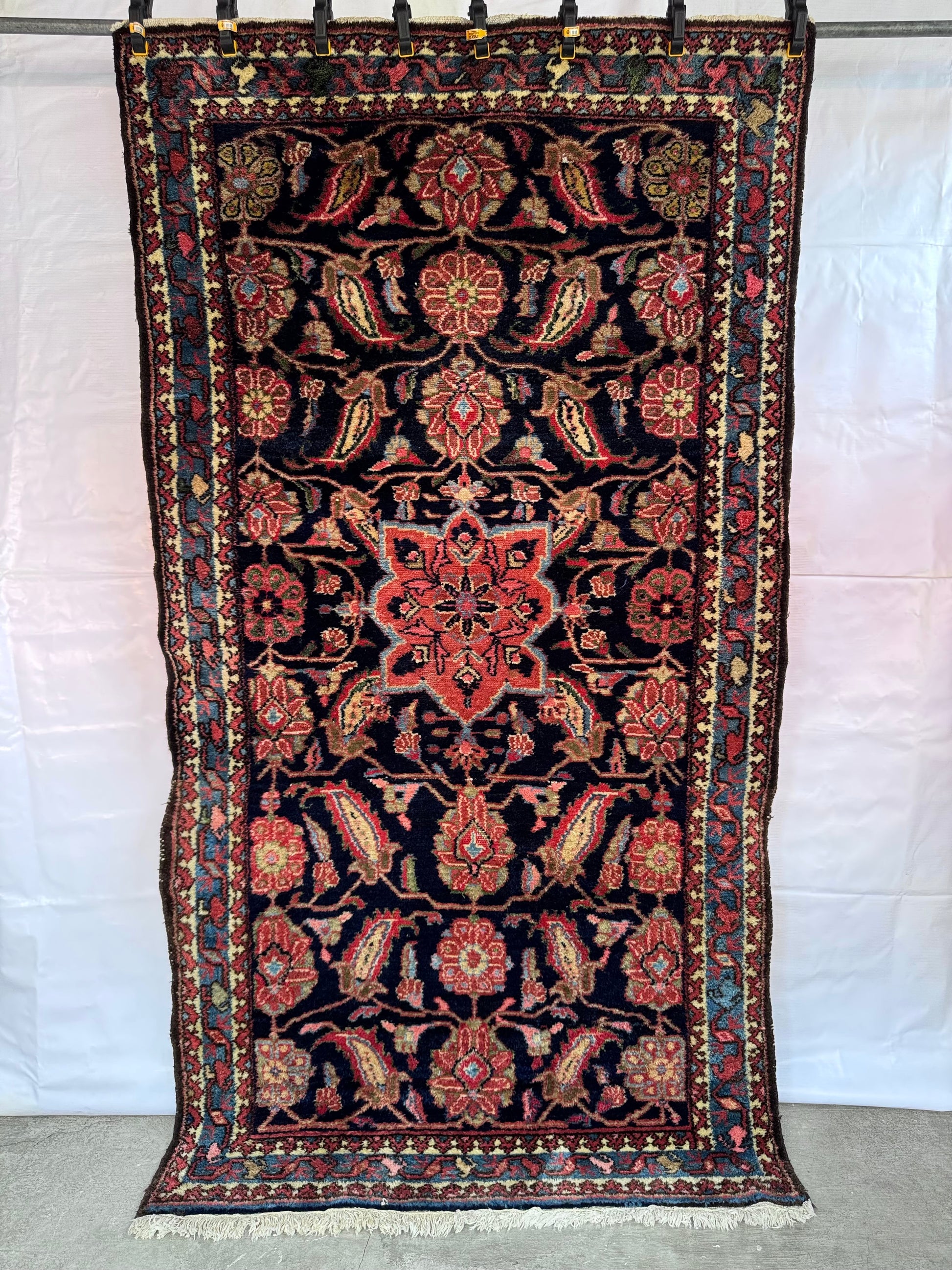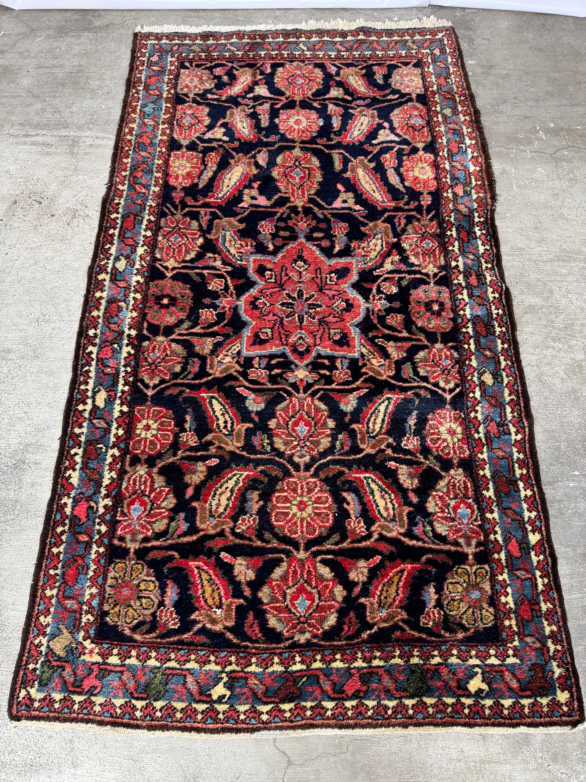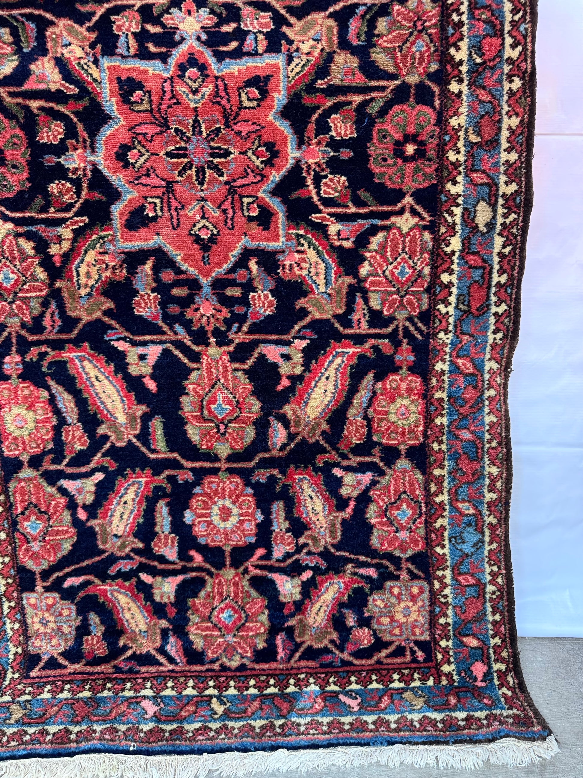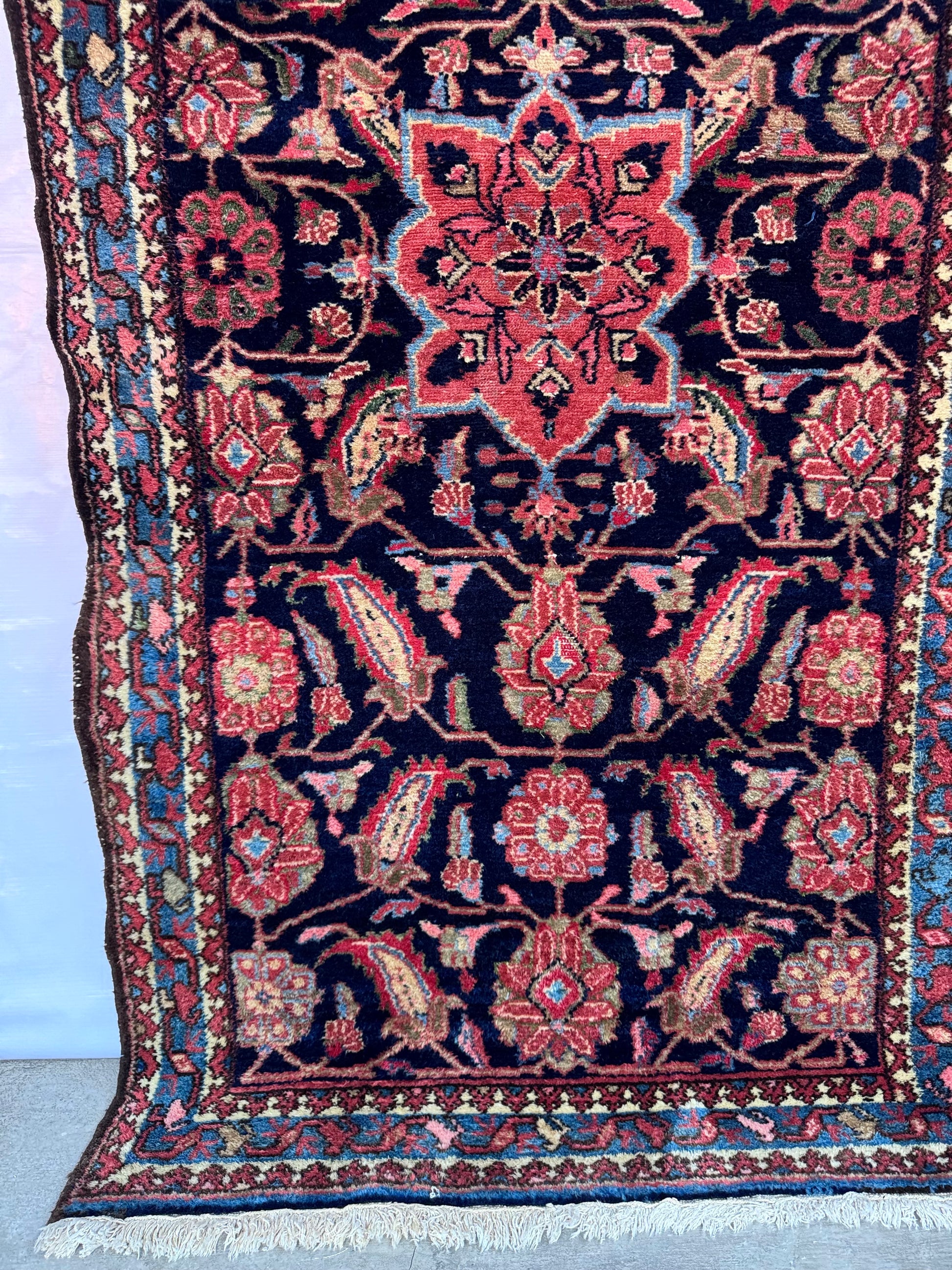 In very good vintage condition with minimal wear - small barely visible bald spot. Intact fringes and sides. Beautiful dark blue background with an all over floral pattern.
