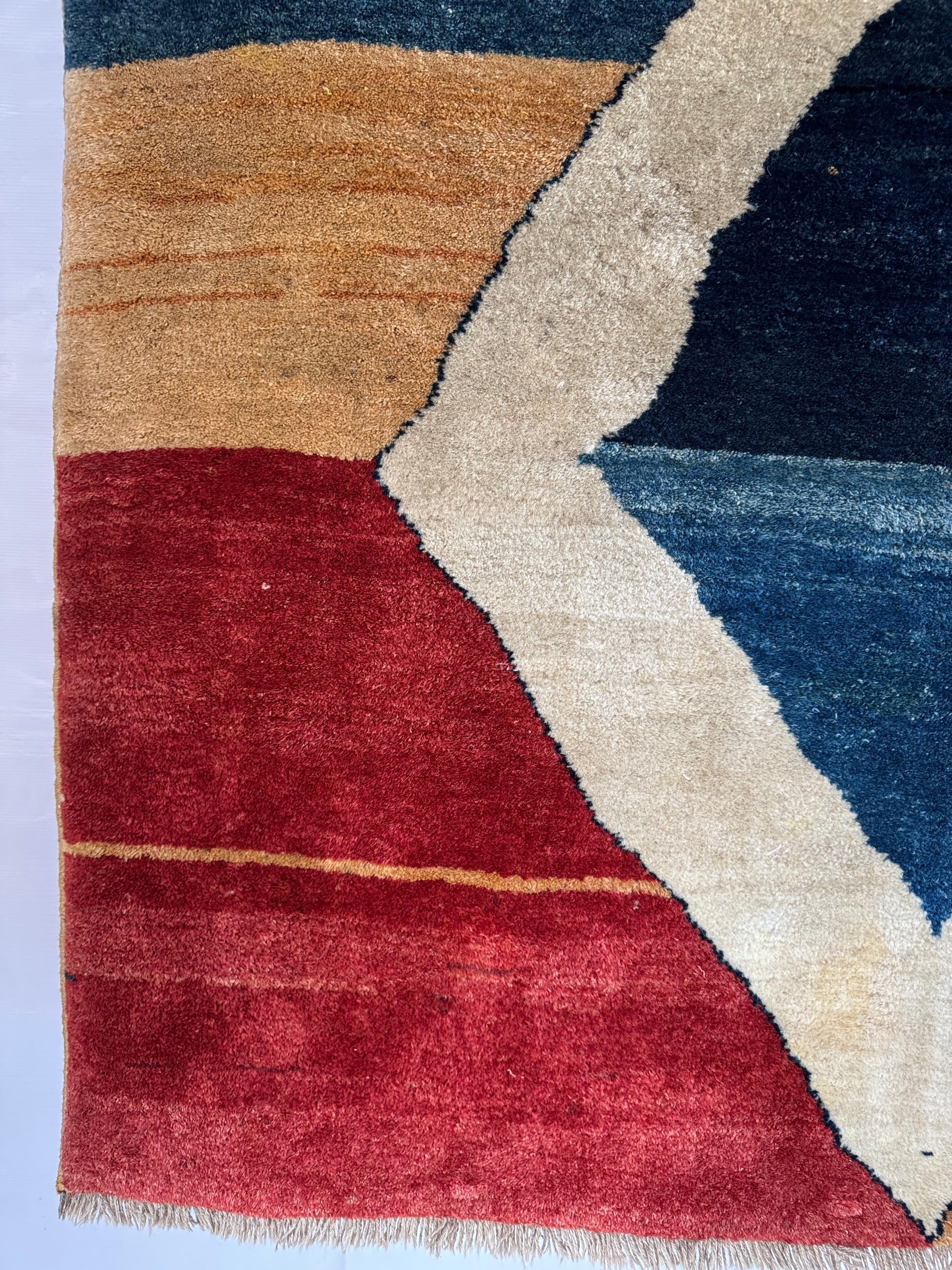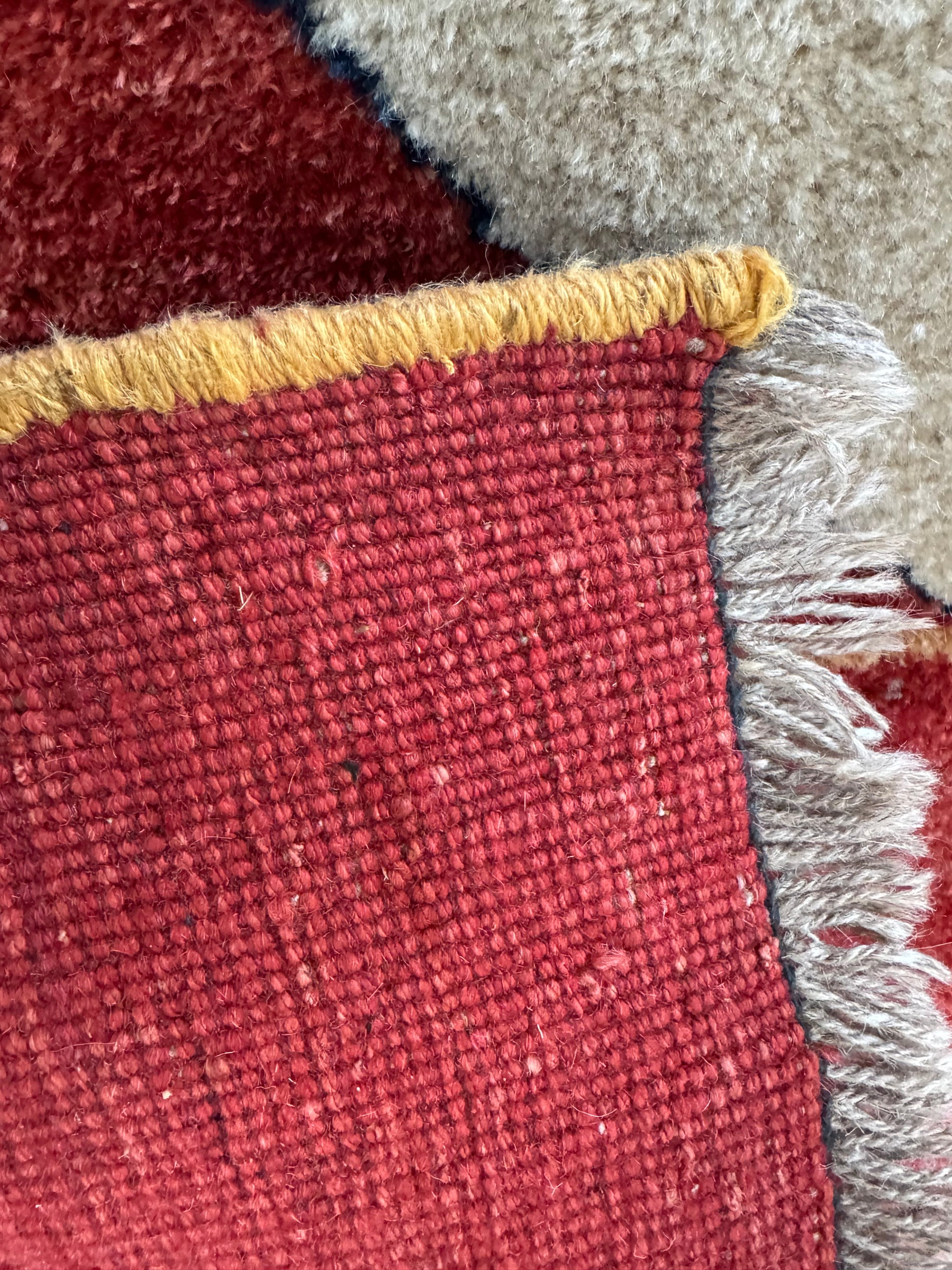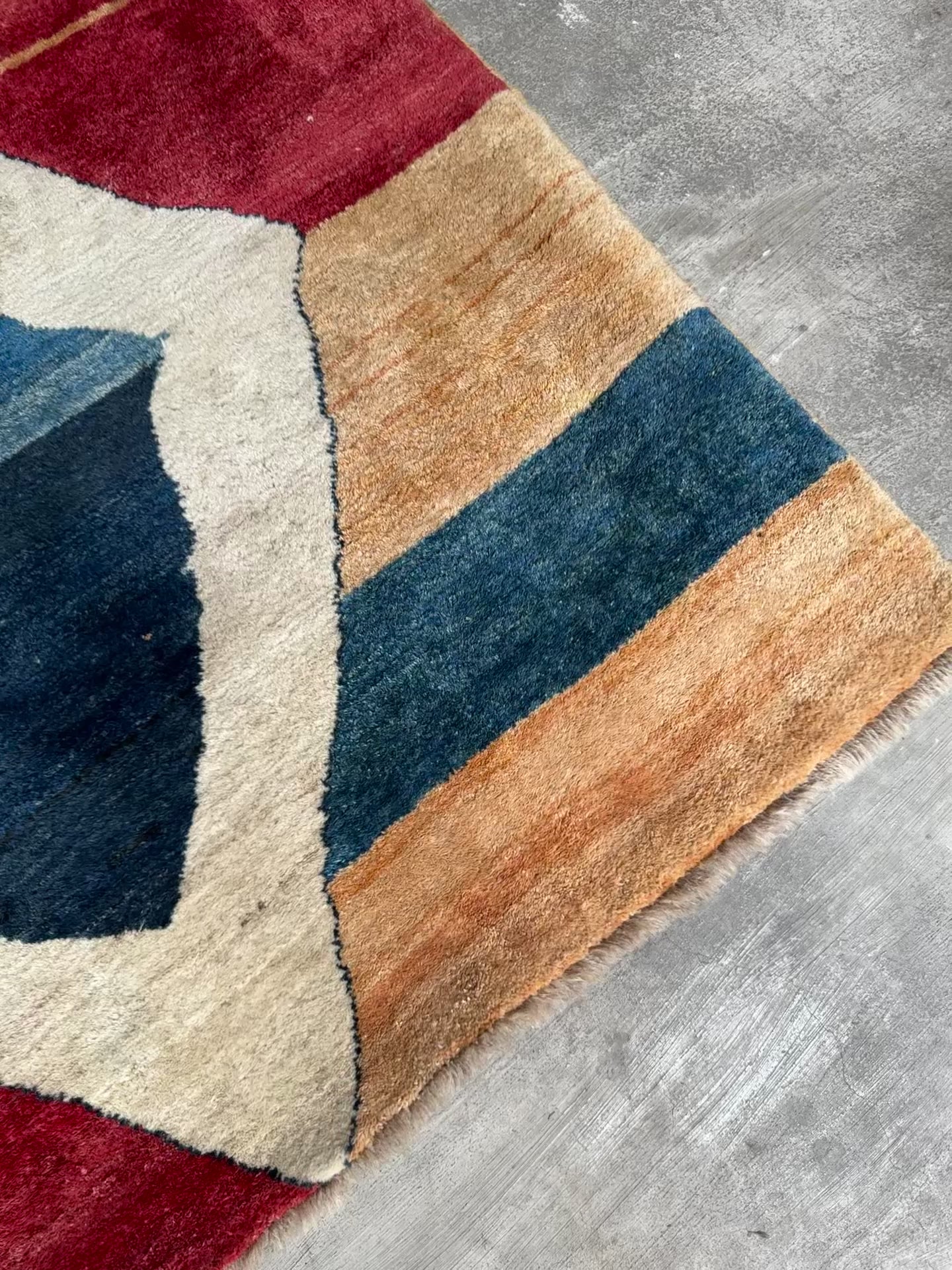 In very good vintage condition with minimal wears - small aged stains on the pile. Thick, and sturdily knotted rug with reinforced fringes. Suited for heavy foot traffic. Love the color blocking on this rug.