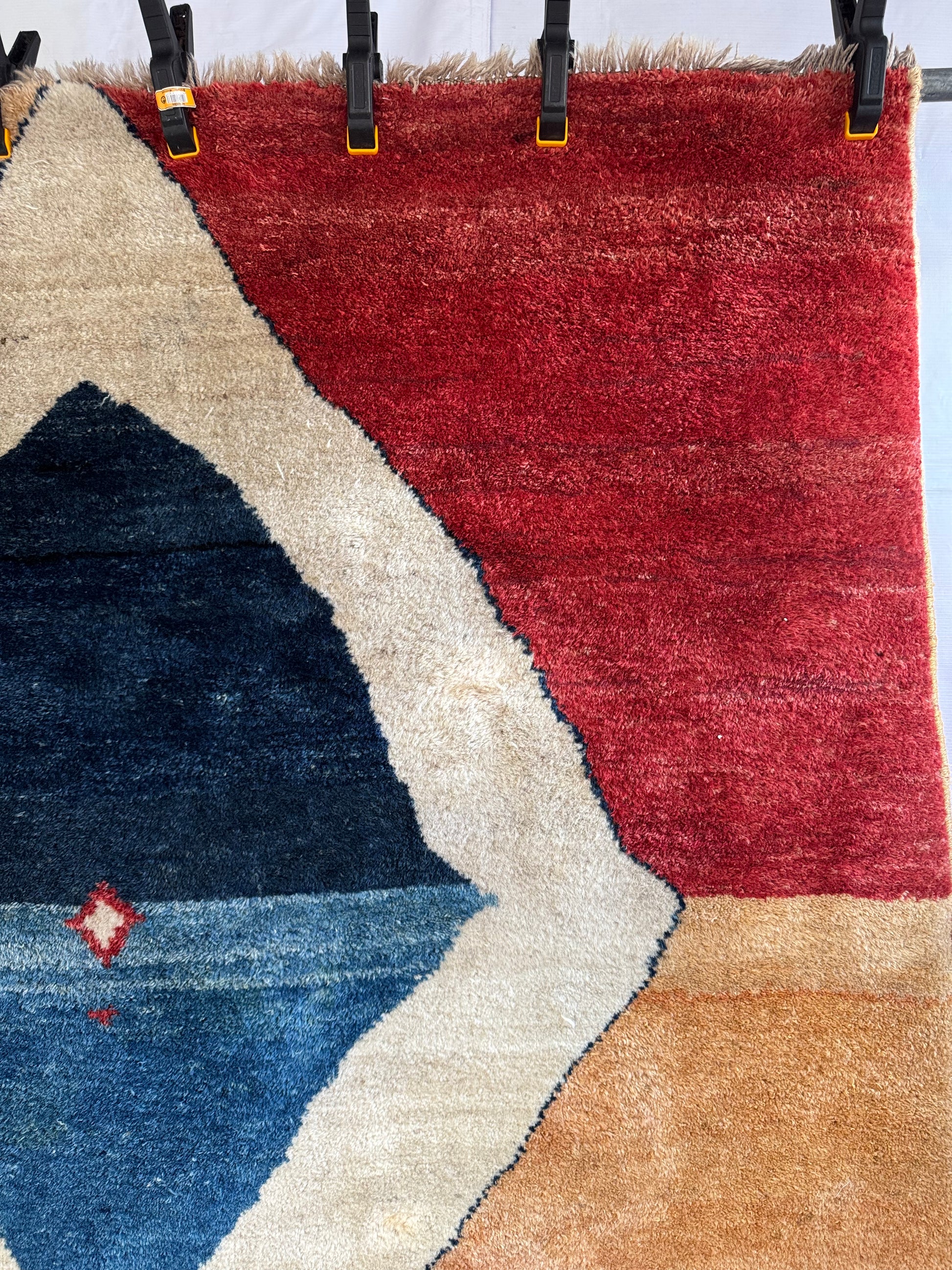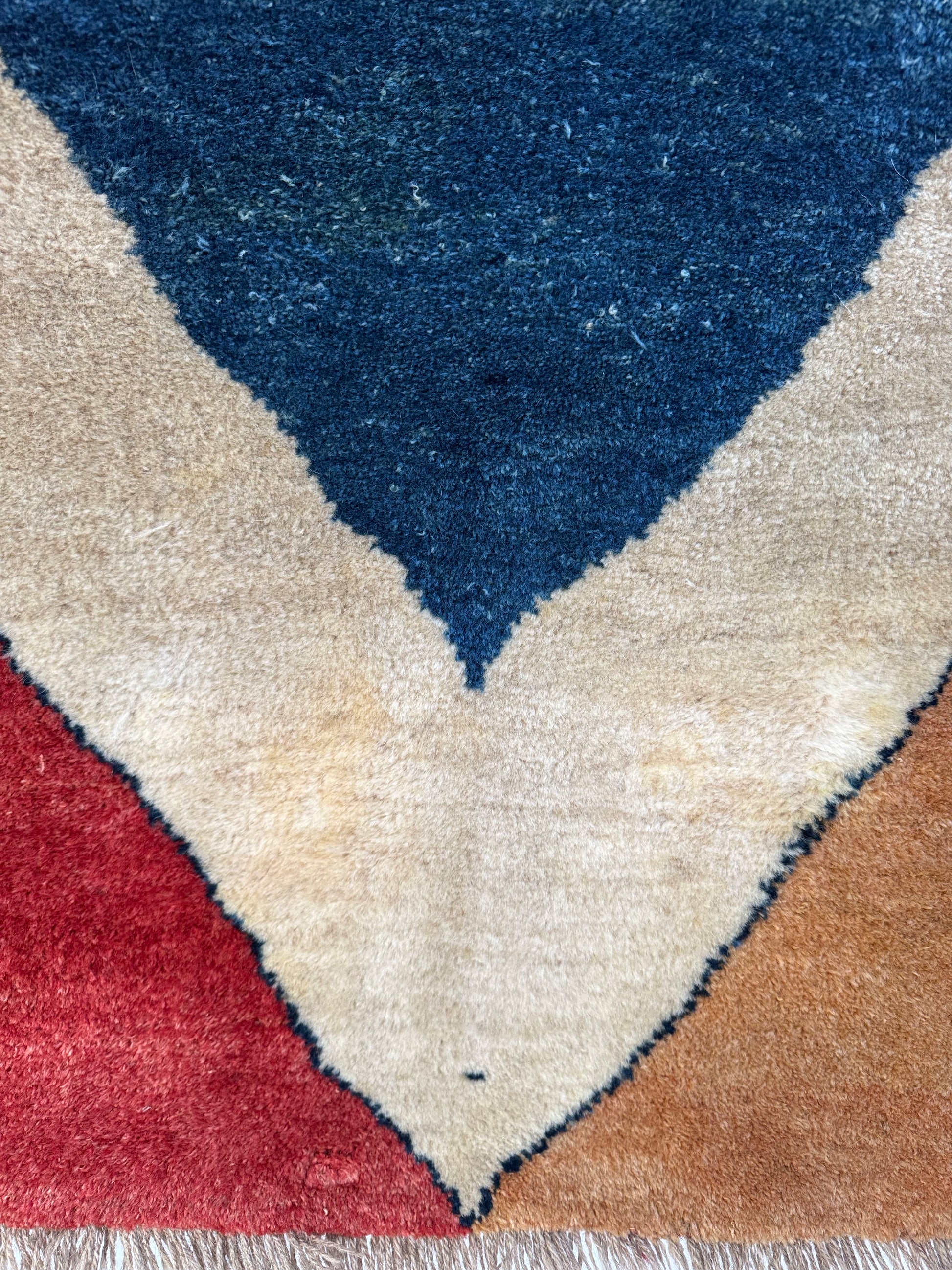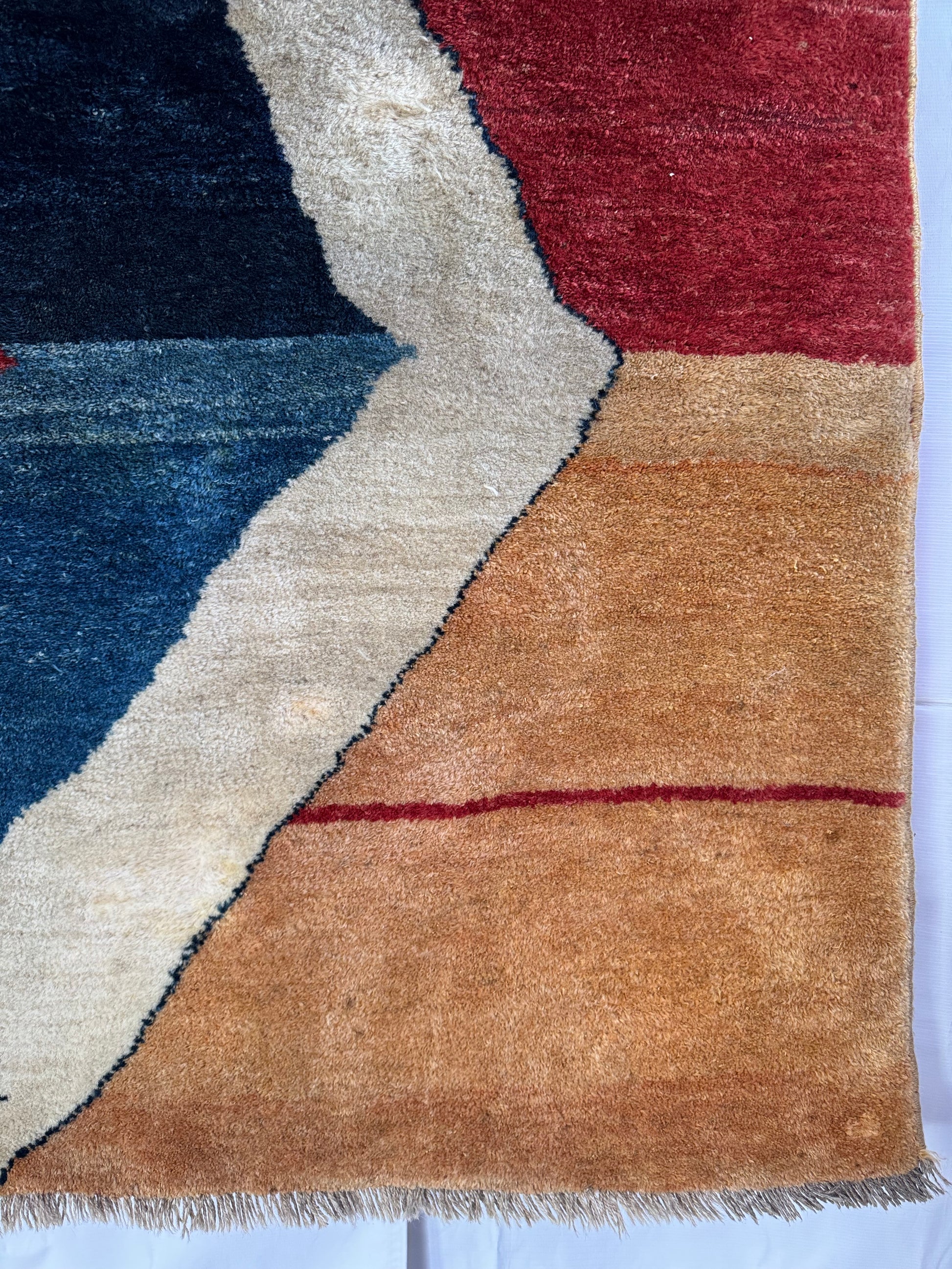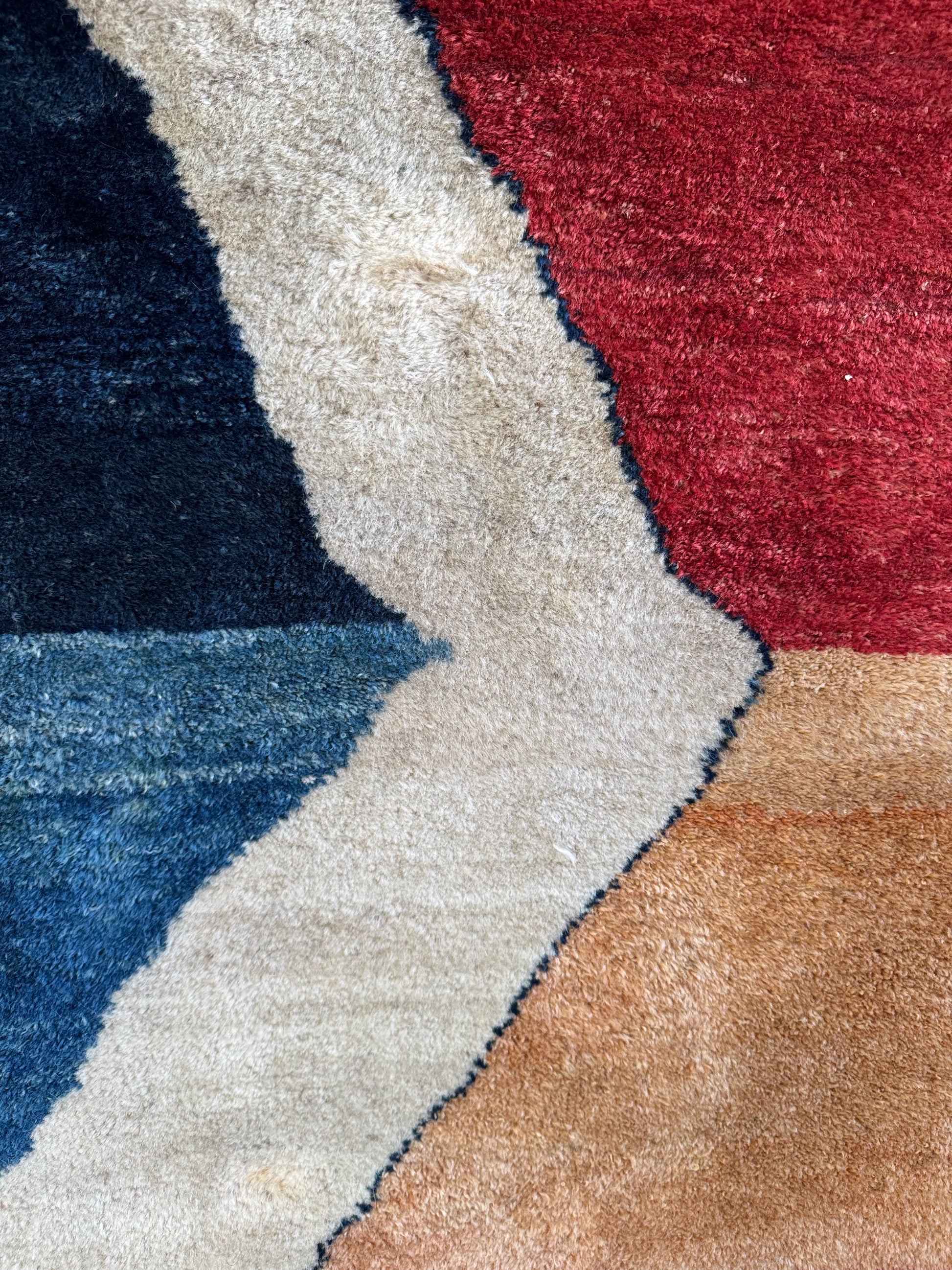 In very good vintage condition with minimal wears - small aged stains on the pile. Thick, and sturdily knotted rug with reinforced fringes. Suited for heavy foot traffic. Love the color blocking on this rug.