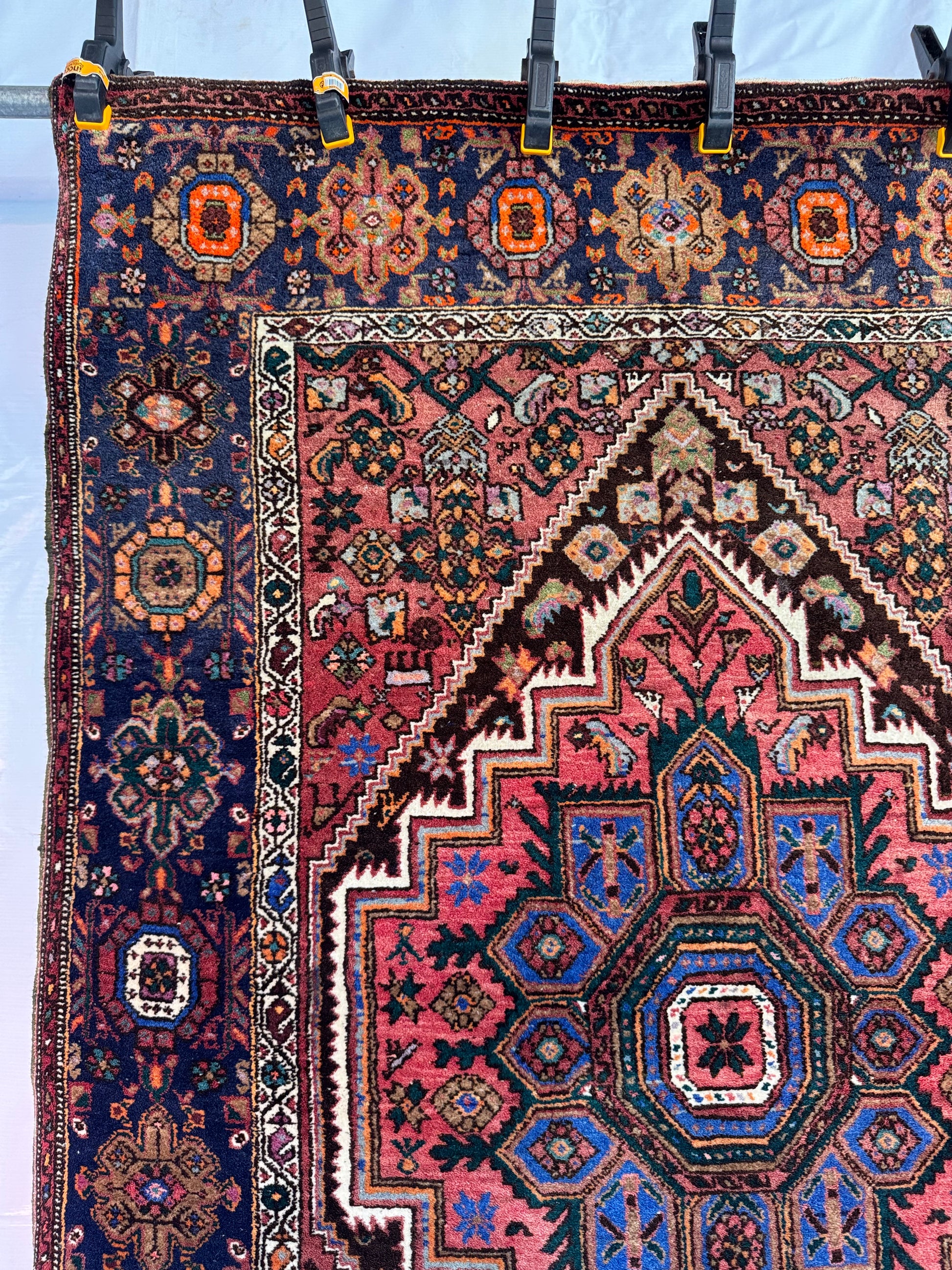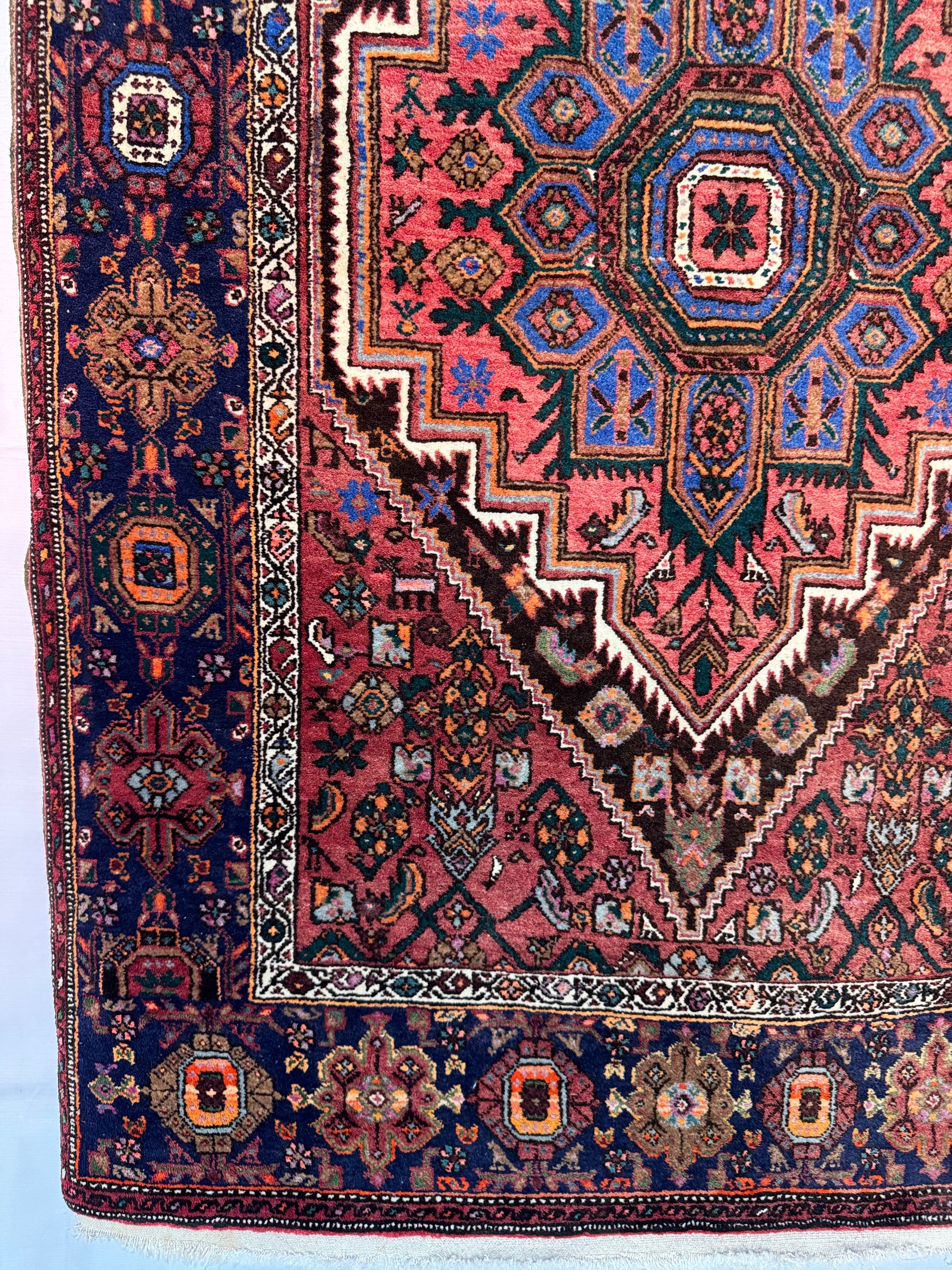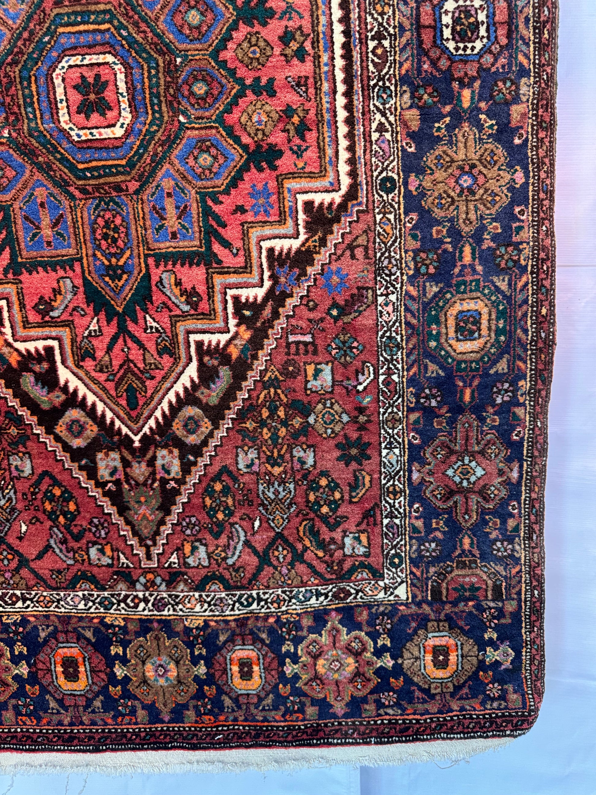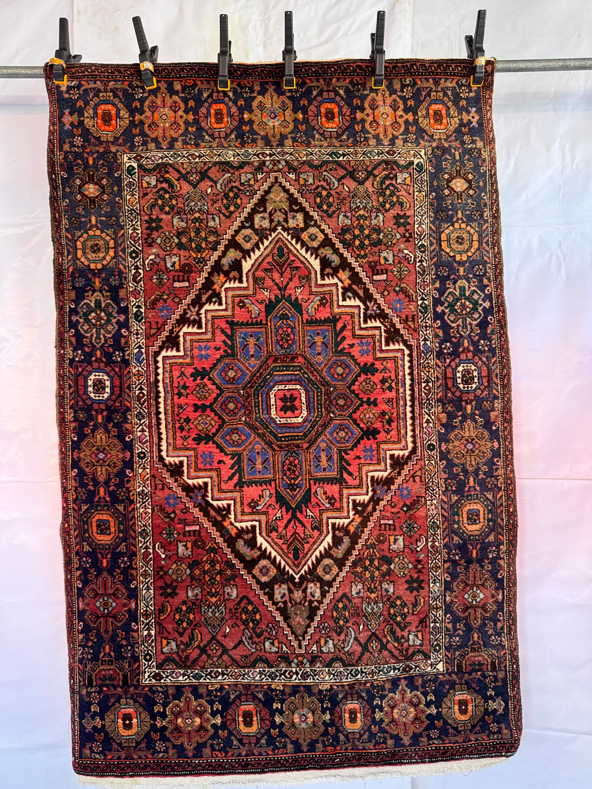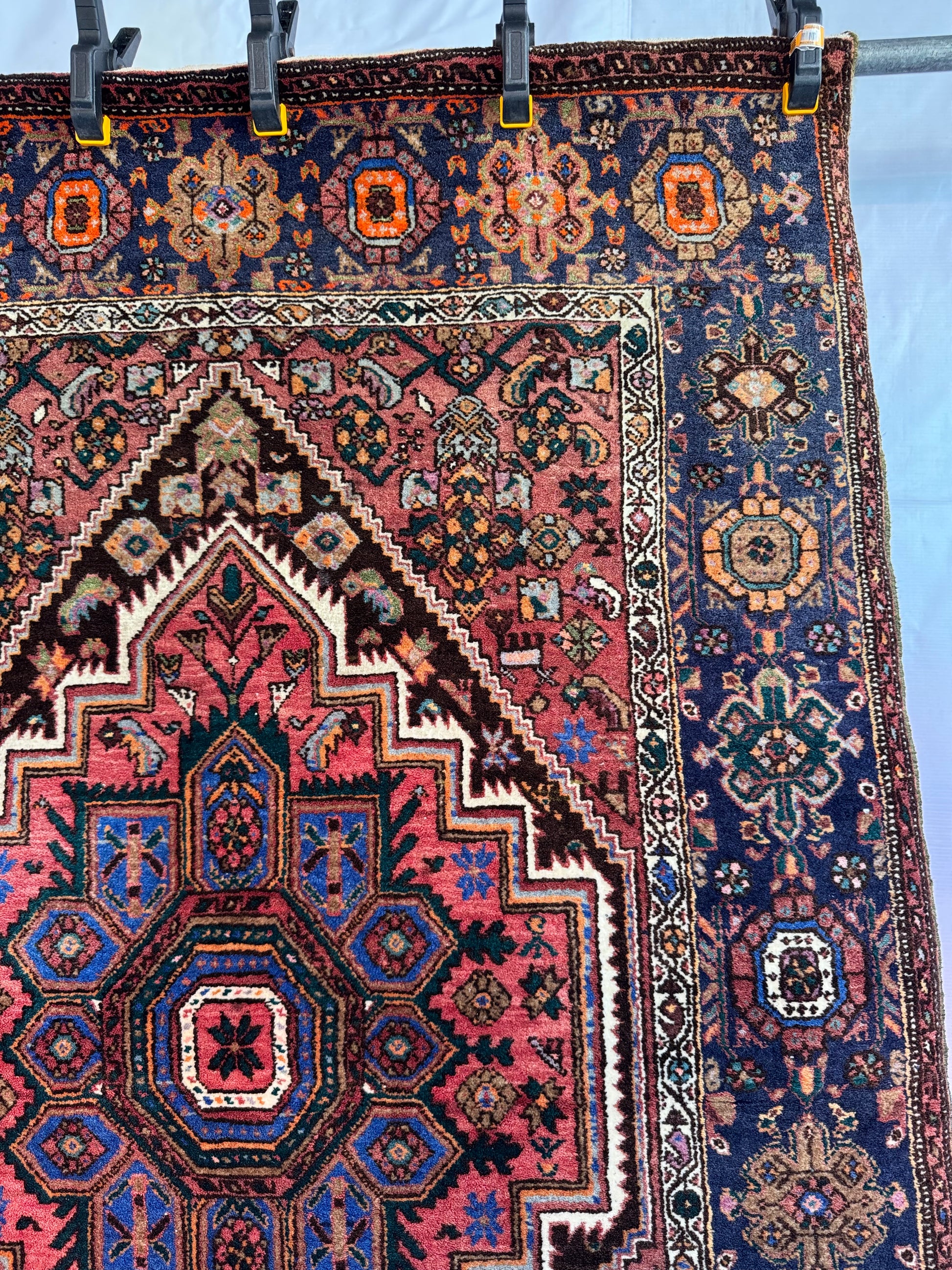 In very good condition with minimal wears - slight fringe wear and color fading. Finely knotted, soft wool on wool weave. Tribal design motif with a lovely central medallion and beautiful dark blue borders.