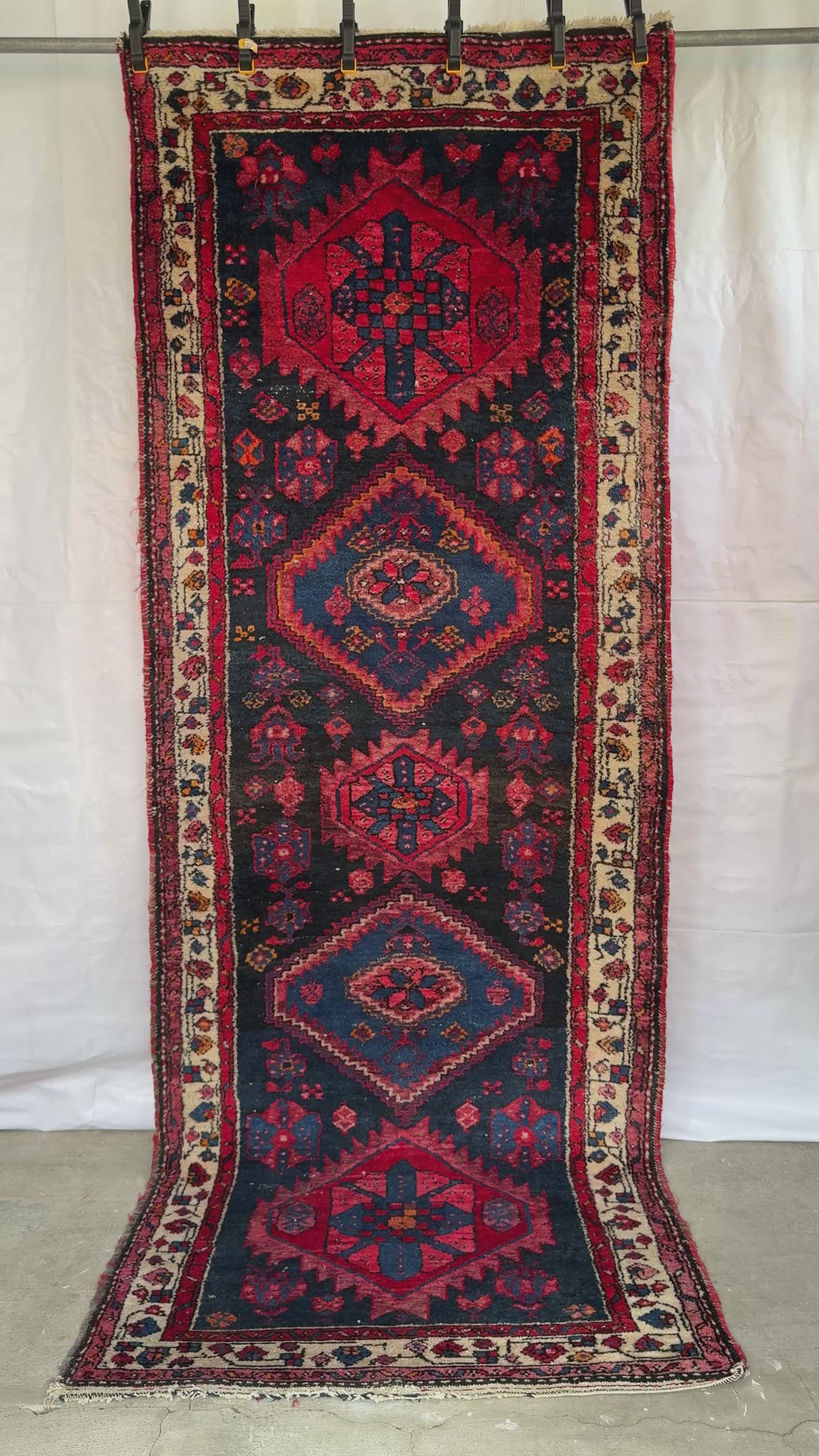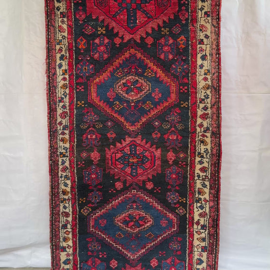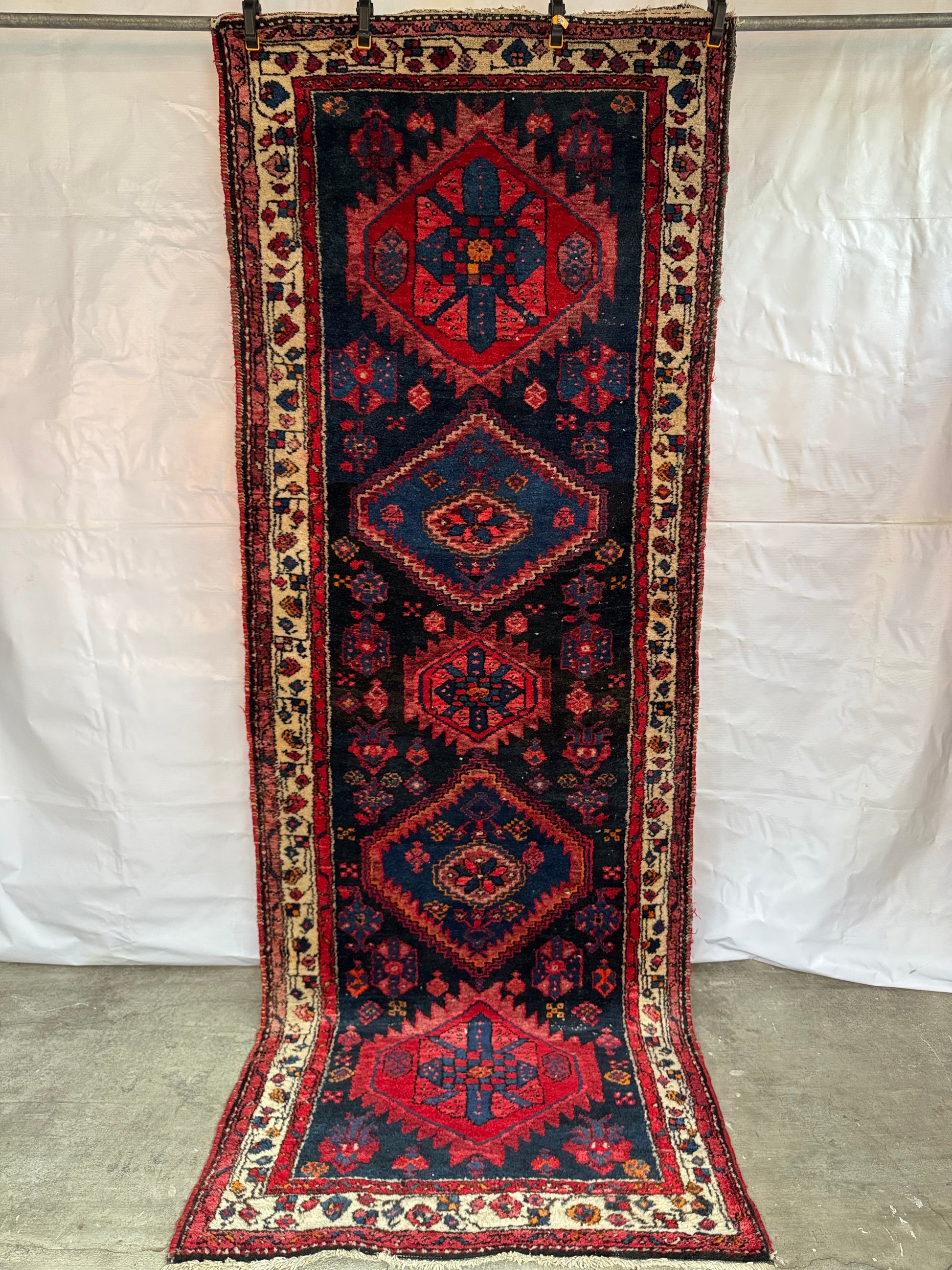 A vintage Persian Hamadan runner, woven in the heart of Iran’s rug-weaving traditions. This piece features a striking series of stacked medallions, each detailed with intricate geometric motifs. The deep blue central medallion stands out beautifully against a dark field, while vibrant red accents add warmth and depth. The ivory-bordered frame, decorated with stylized floral elements, brings balance to the bold composition.