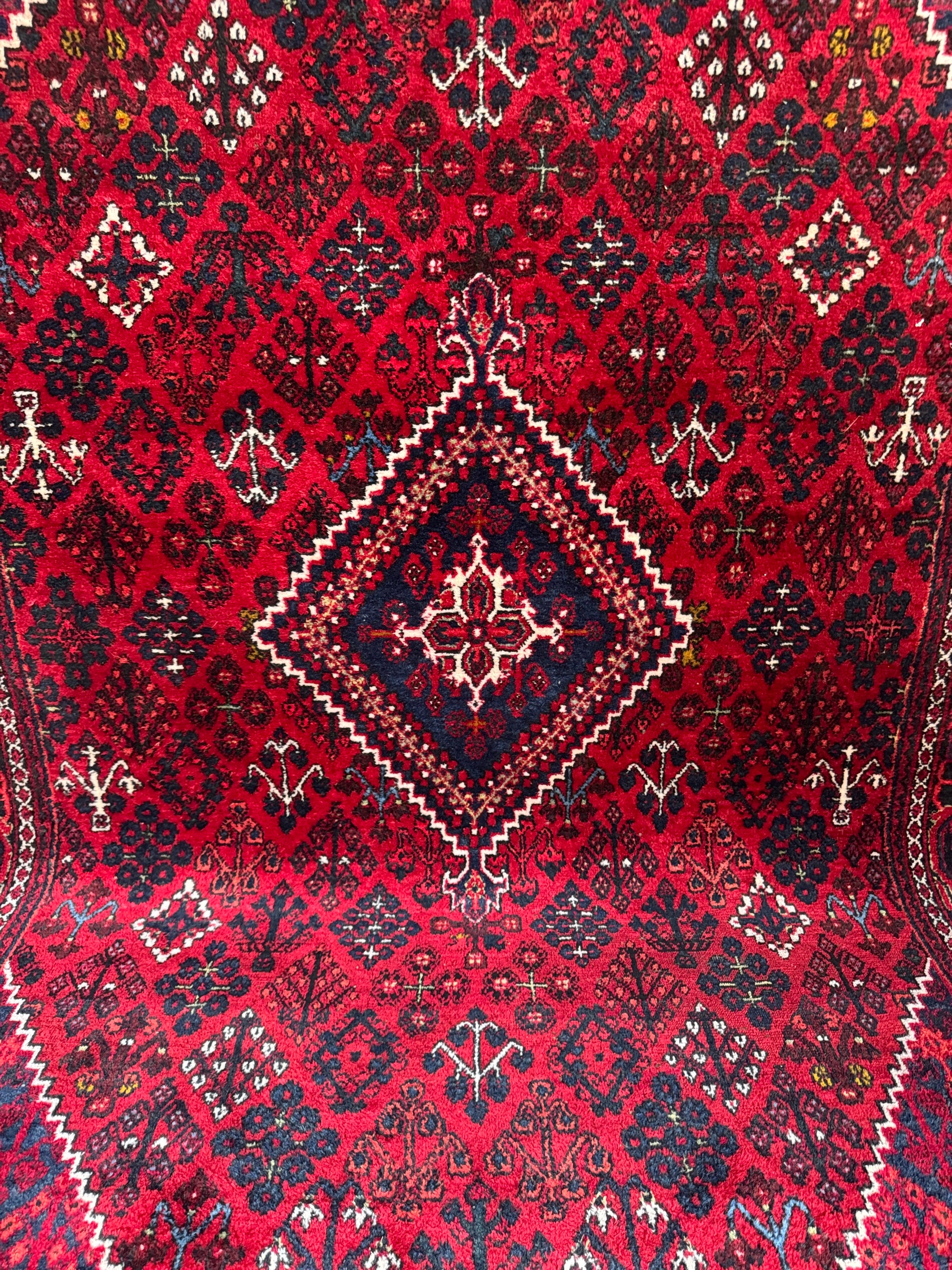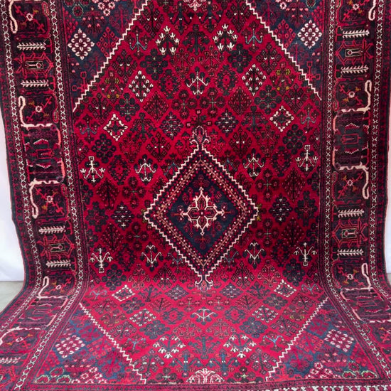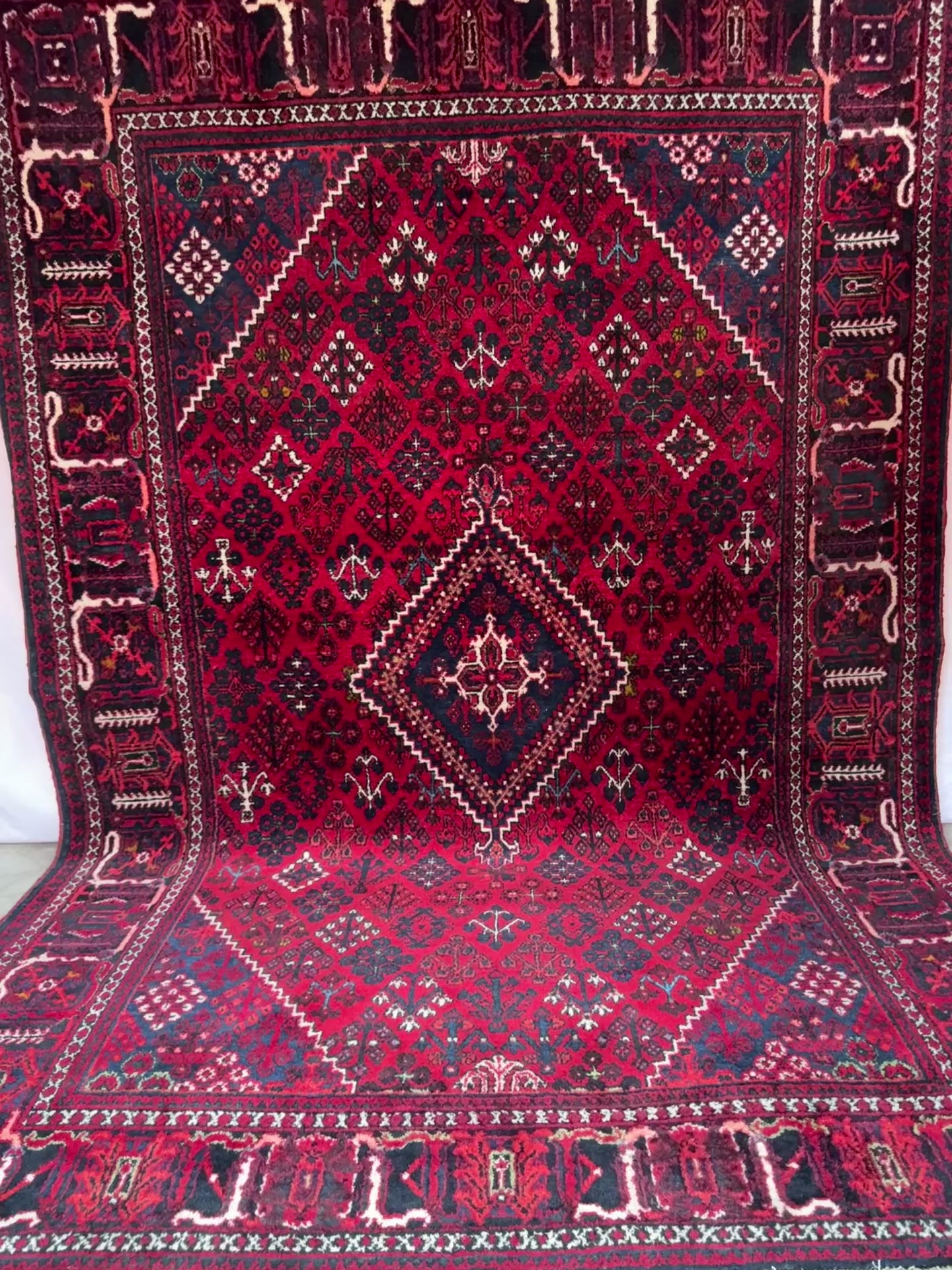 A striking Joshegan rug, handwoven in central Iran, where rug weaving traditions date back centuries. Joshegan rugs are known for their iconic geometric latticework, often featuring diamond-shaped medallions and stylized floral motifs—designs that have remained unchanged for generations.