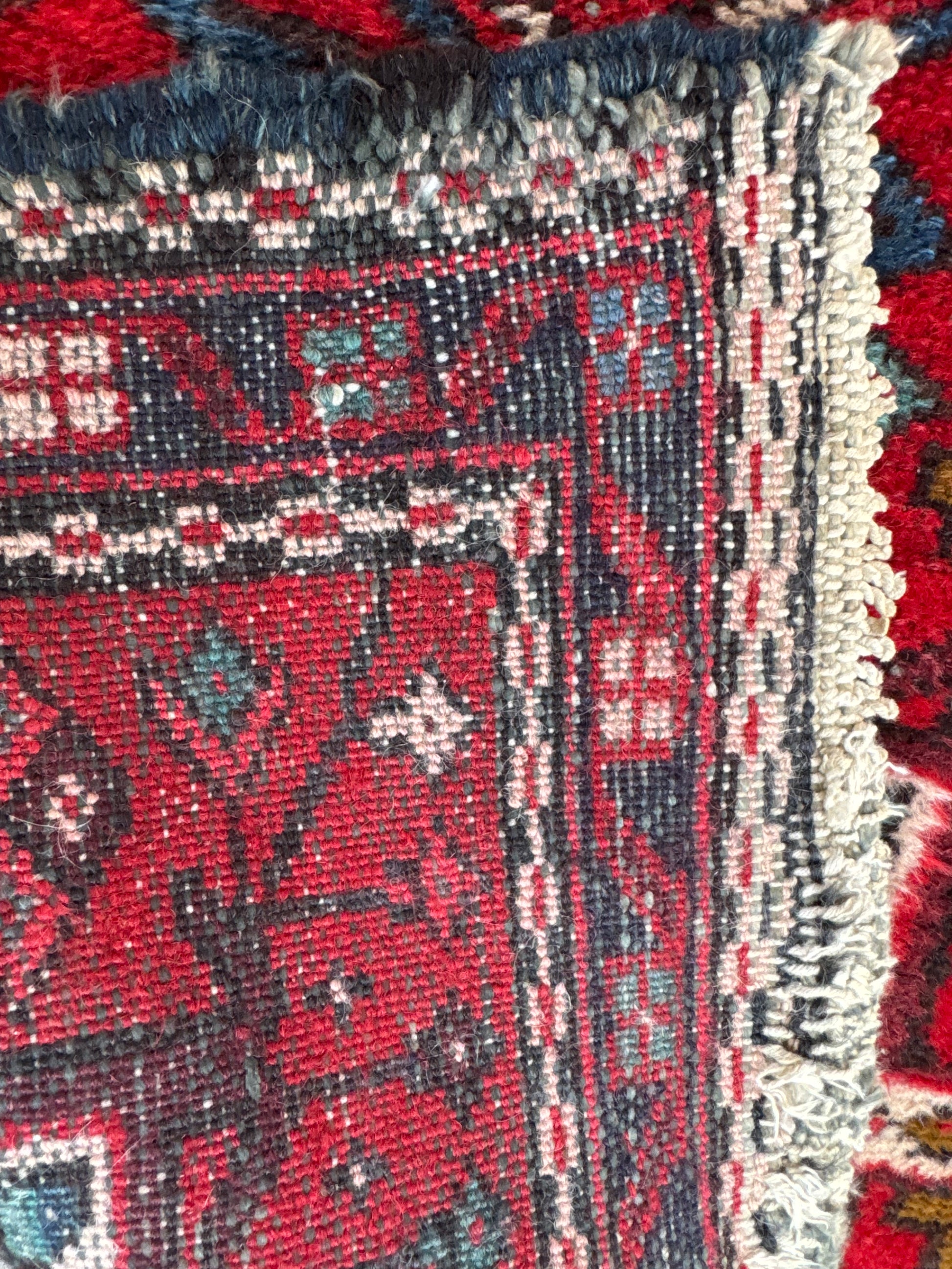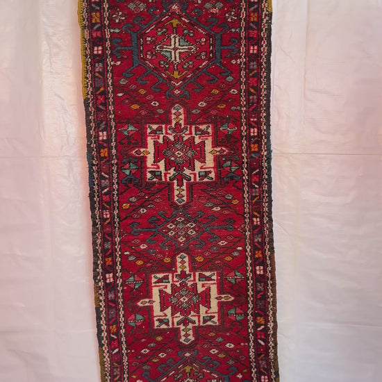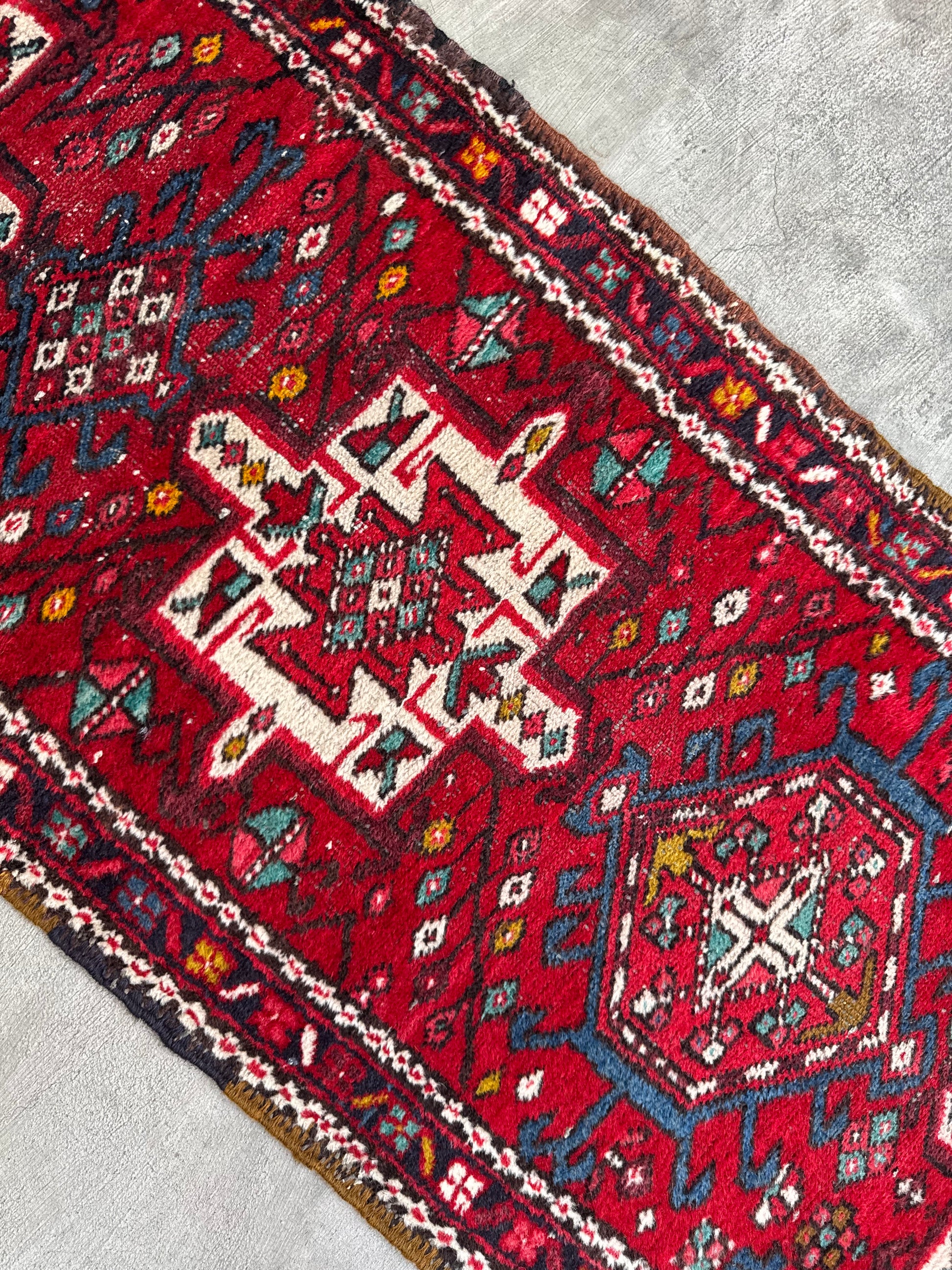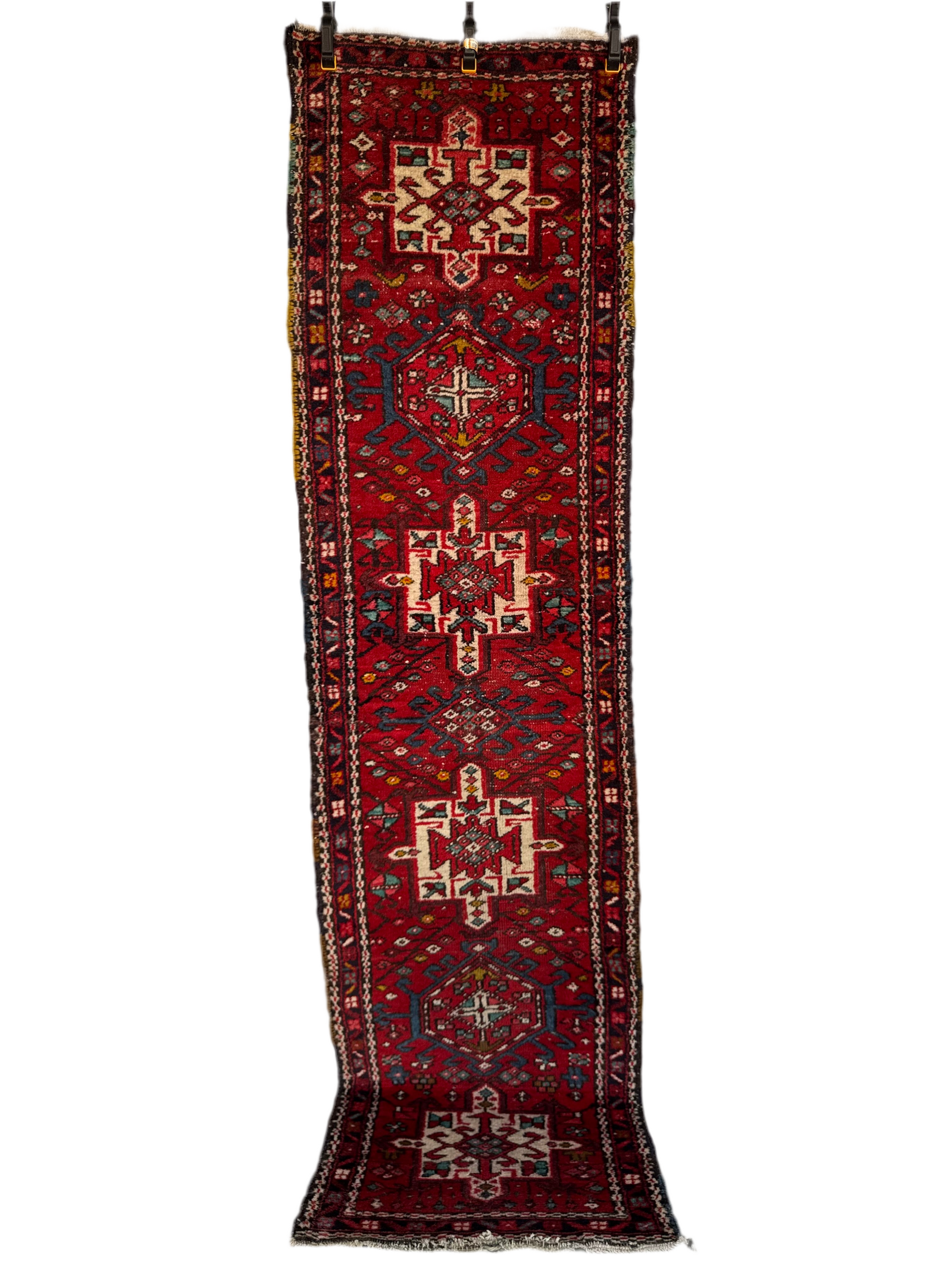 A vintage Karaja runner, handwoven in northwest Iran near the Heriz region. Known for their durability and geometric medallions, Karaja rugs have been crafted for generations by village weavers.
