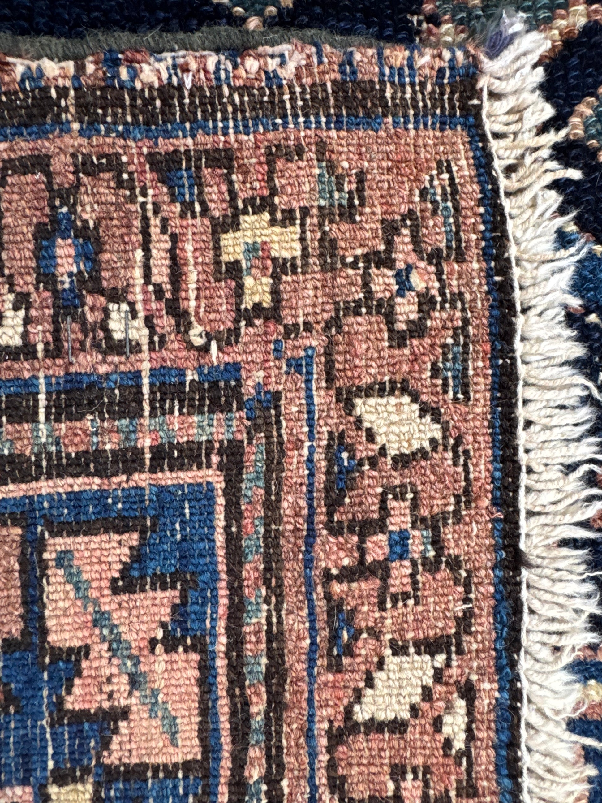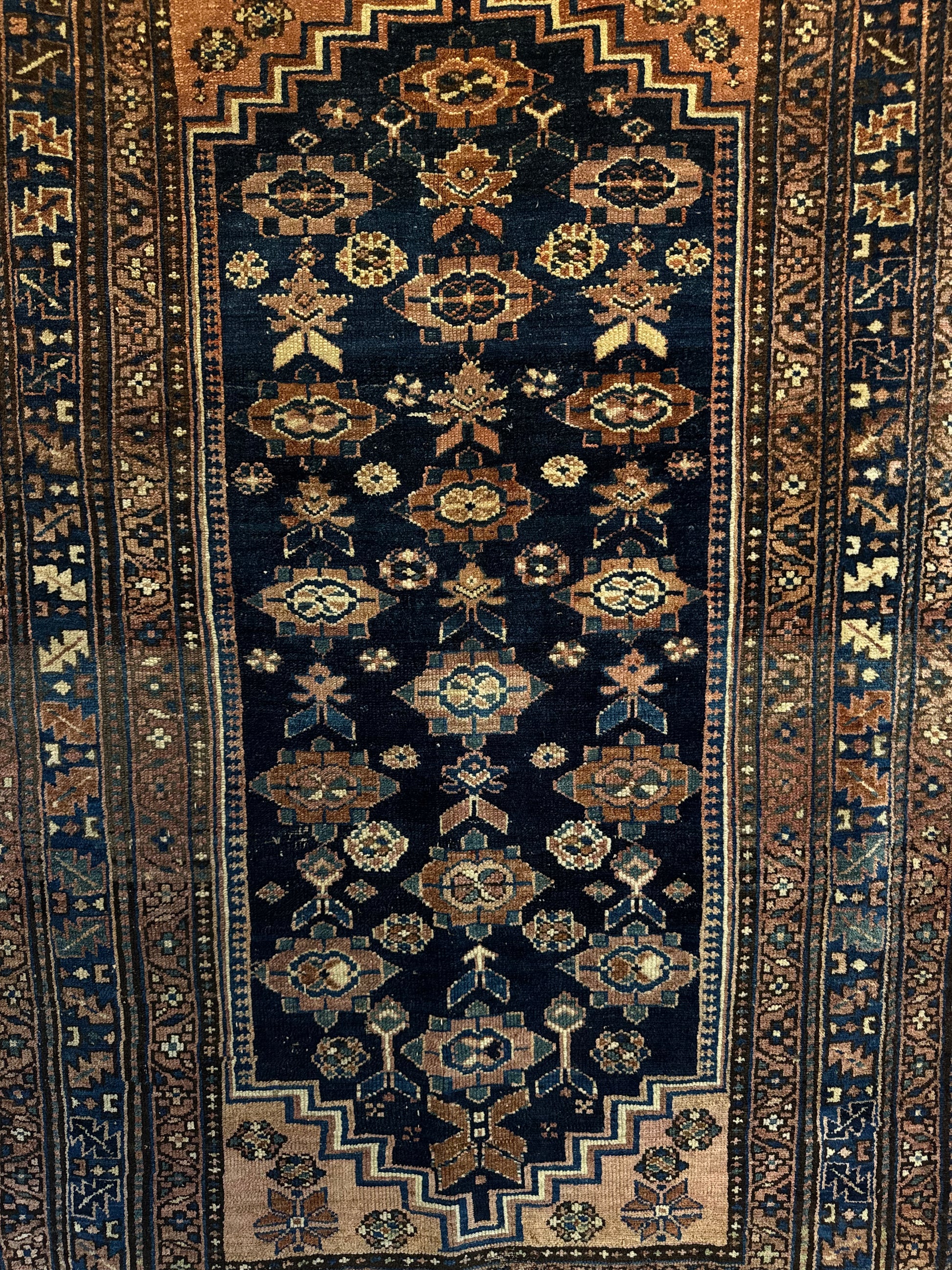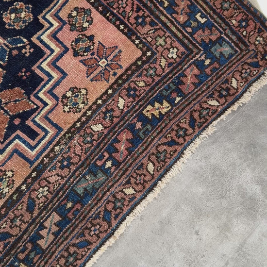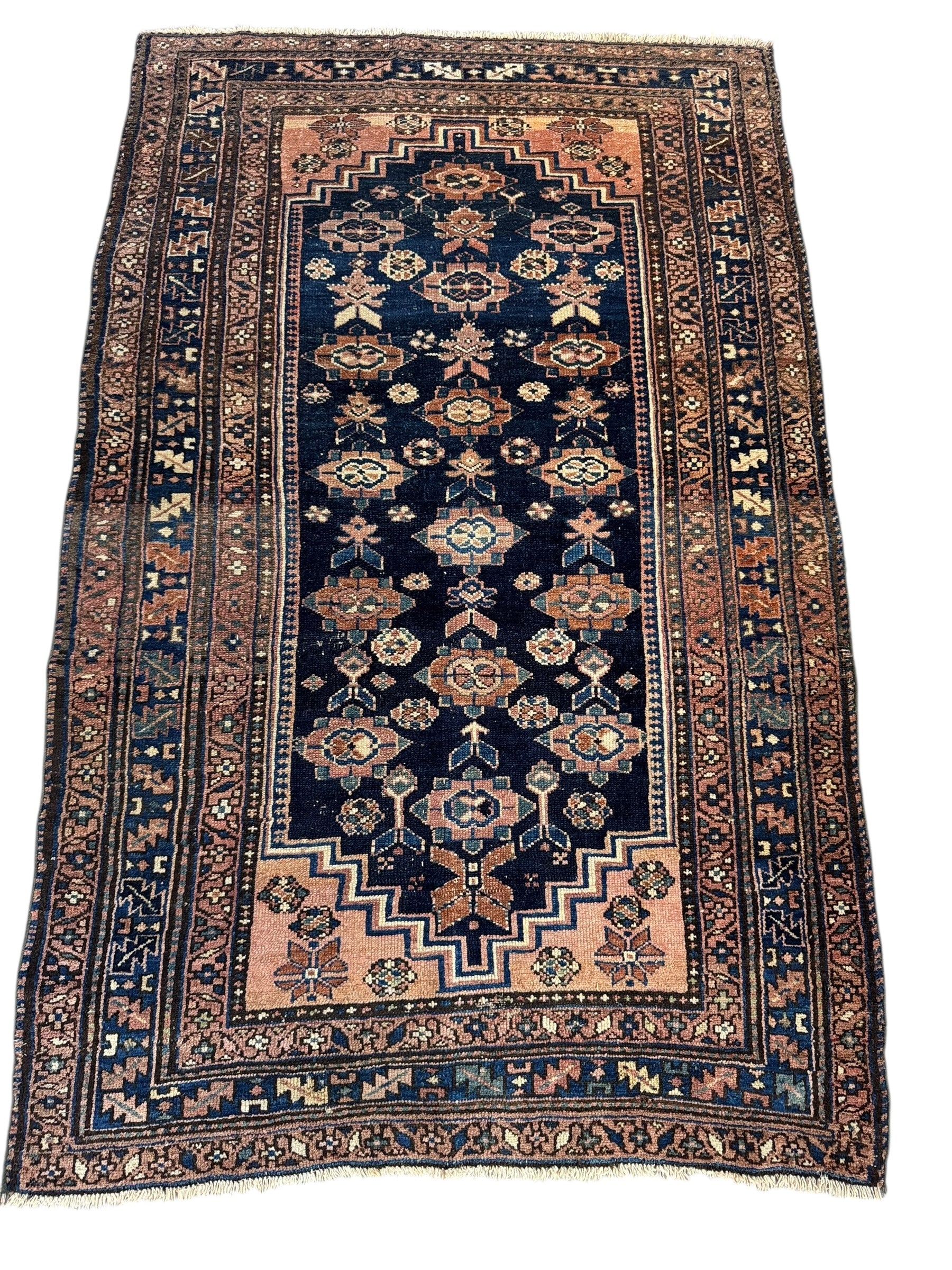 In good antique condition with age wears. Estimated to be as early as 1910s. Deep navy field with stacked rosettes in the medallion. Wears on the pile - thinning and showing visible foundation, but with a pleasant fading of colors from age. Beautiful aged piece!