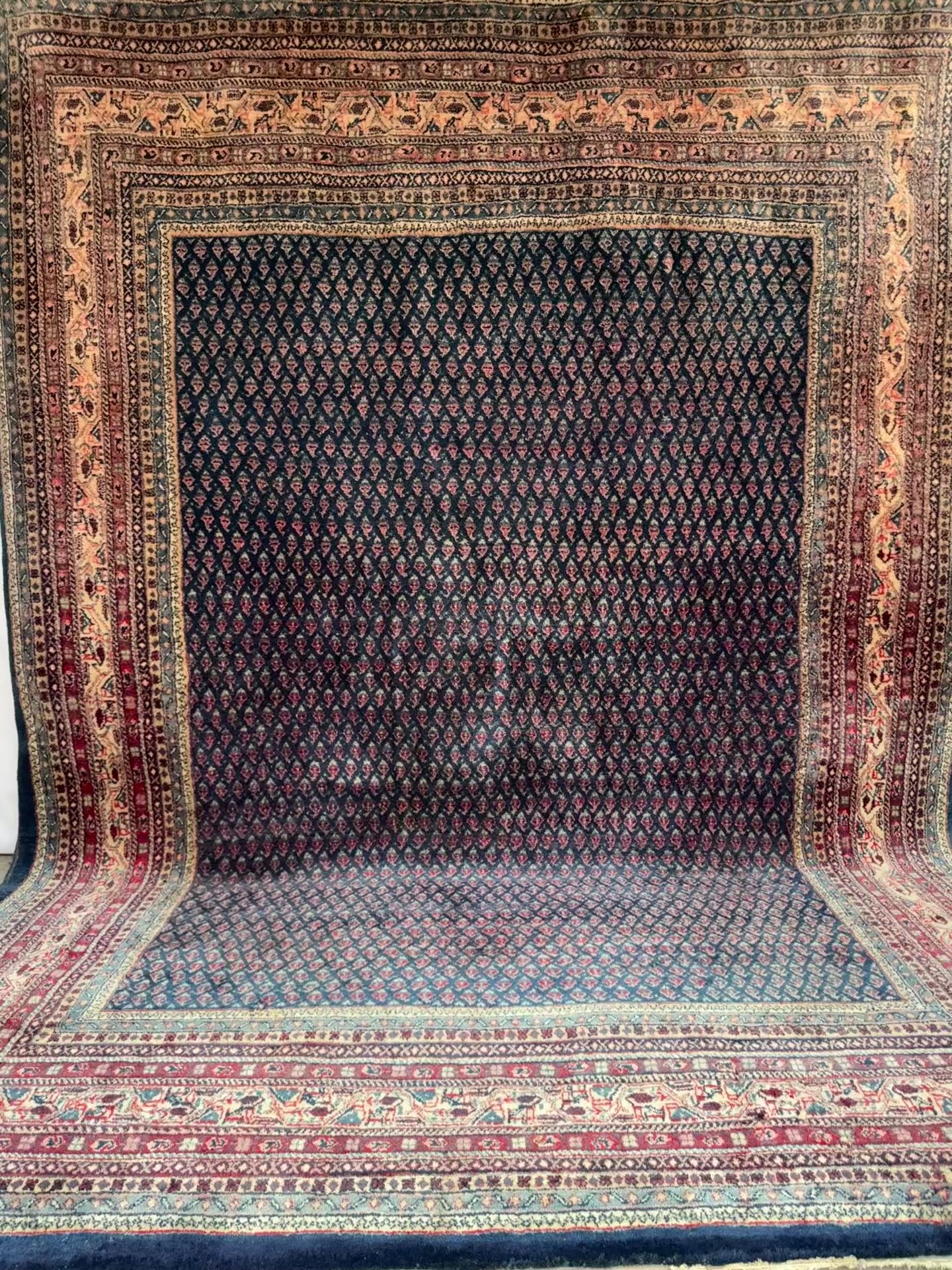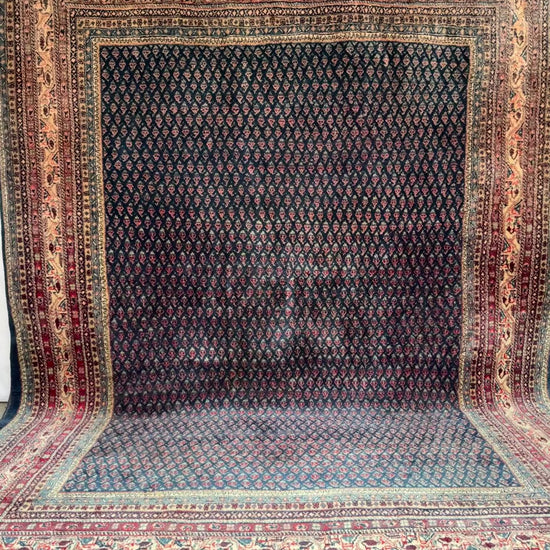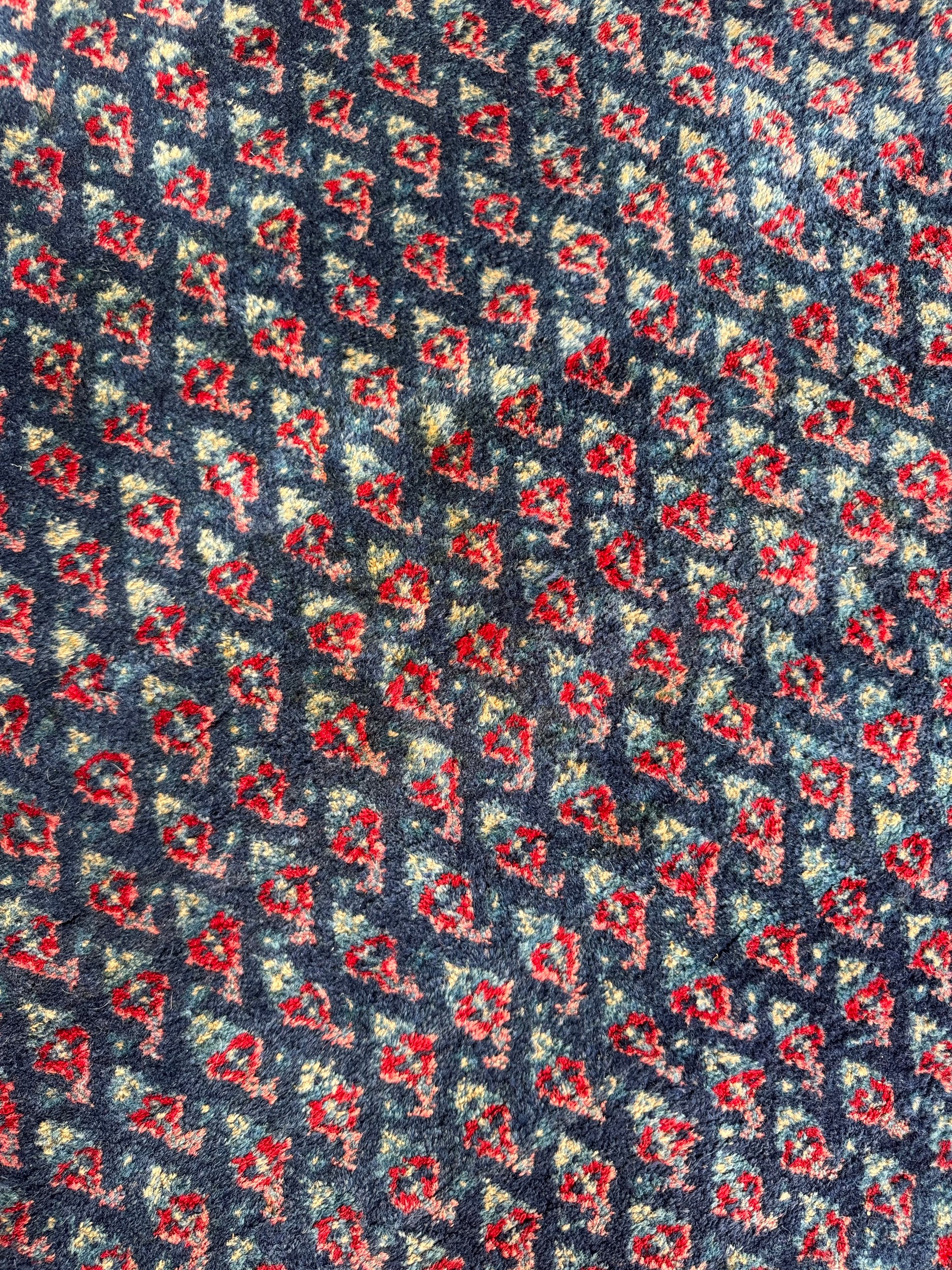 The deep blue field is softened by fading across various sections, giving it a muted, timeworn character. Repeating boteh (paisley) elements in soft reds and ivory add subtle contrast, while the multi-layered borders frame the piece with intricate floral and vine details.