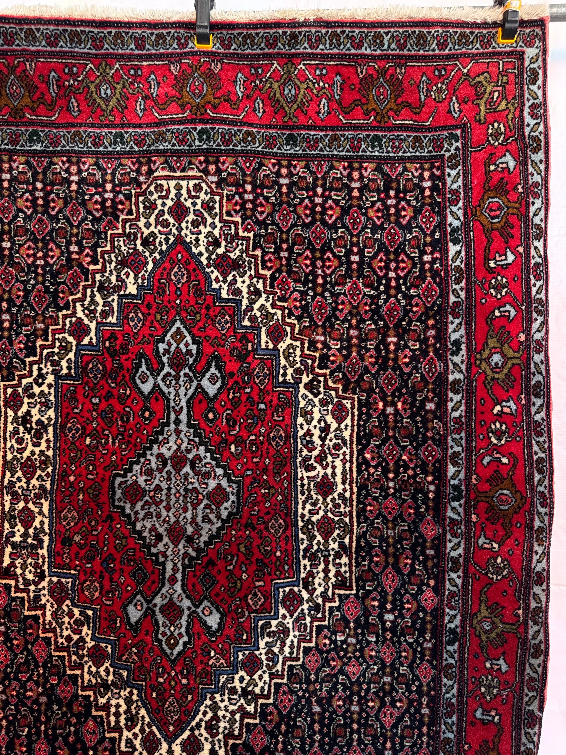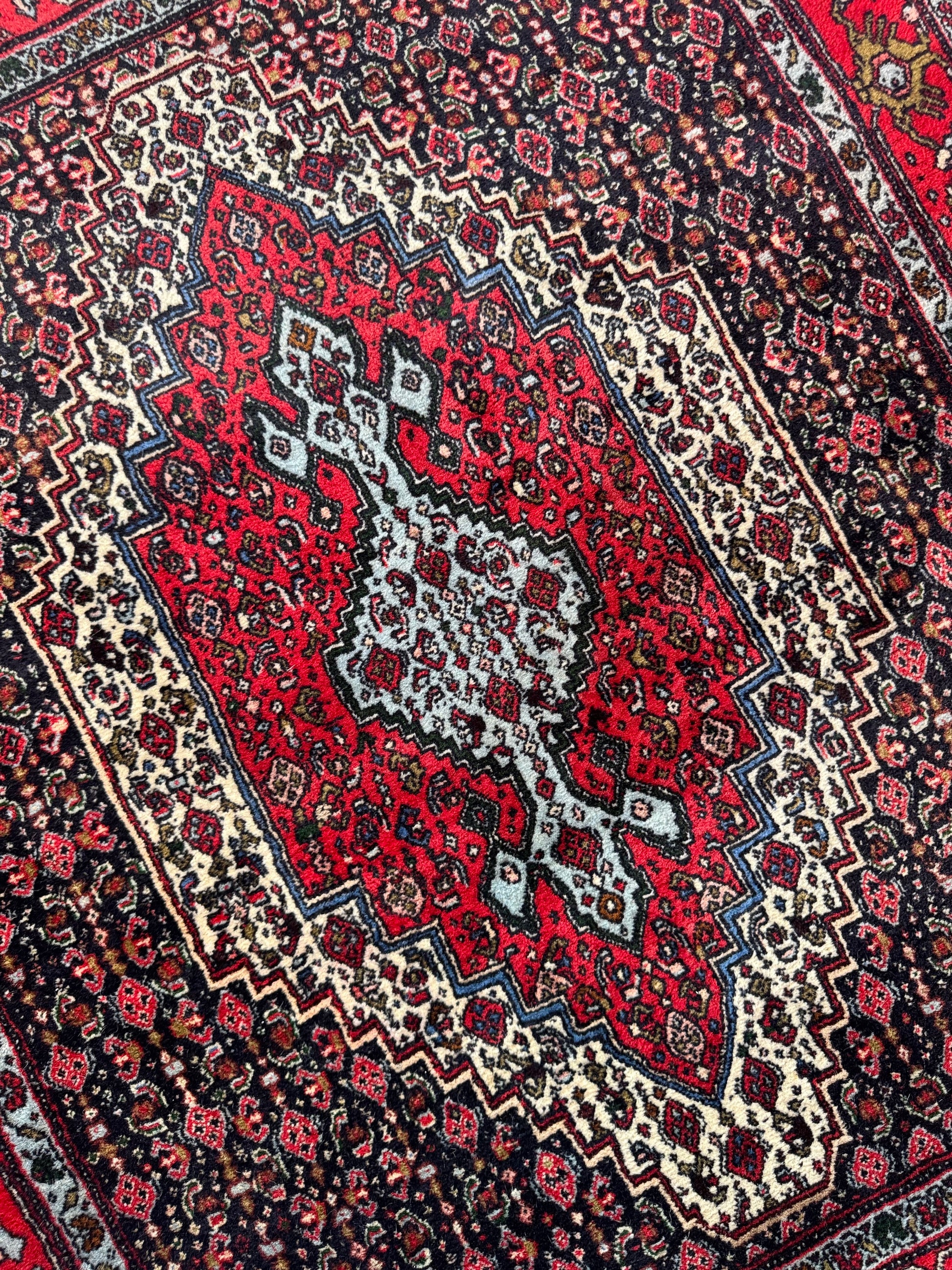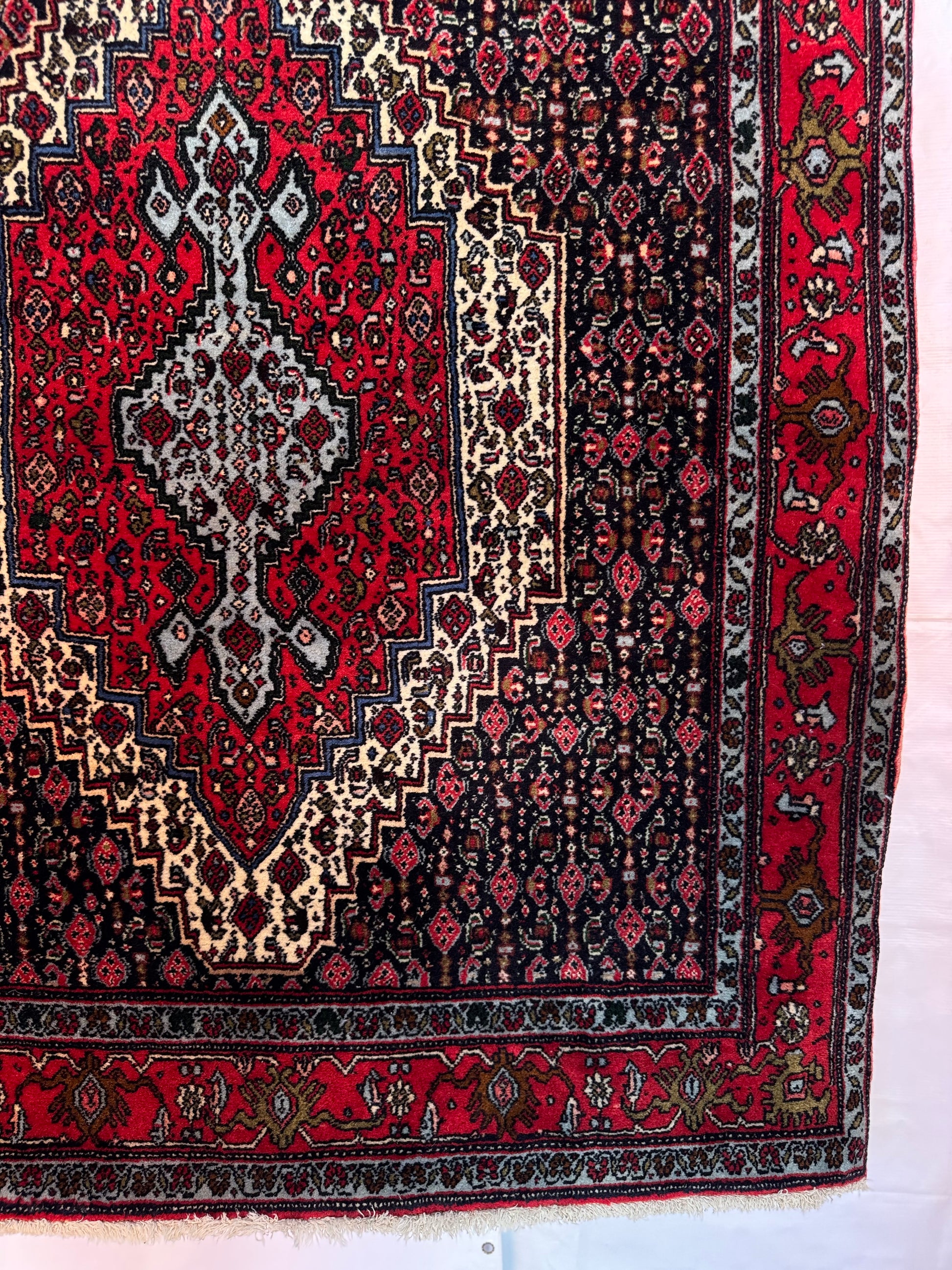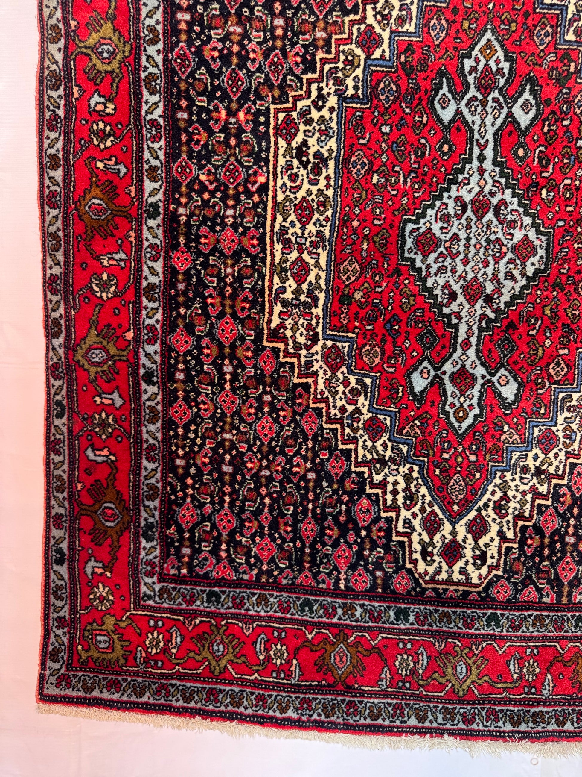 A vintage Senneh rug, handwoven in western Iran. Known for its fine weave and precise patterns, this piece features a striking stepped medallion surrounded by a densely packed floral field.