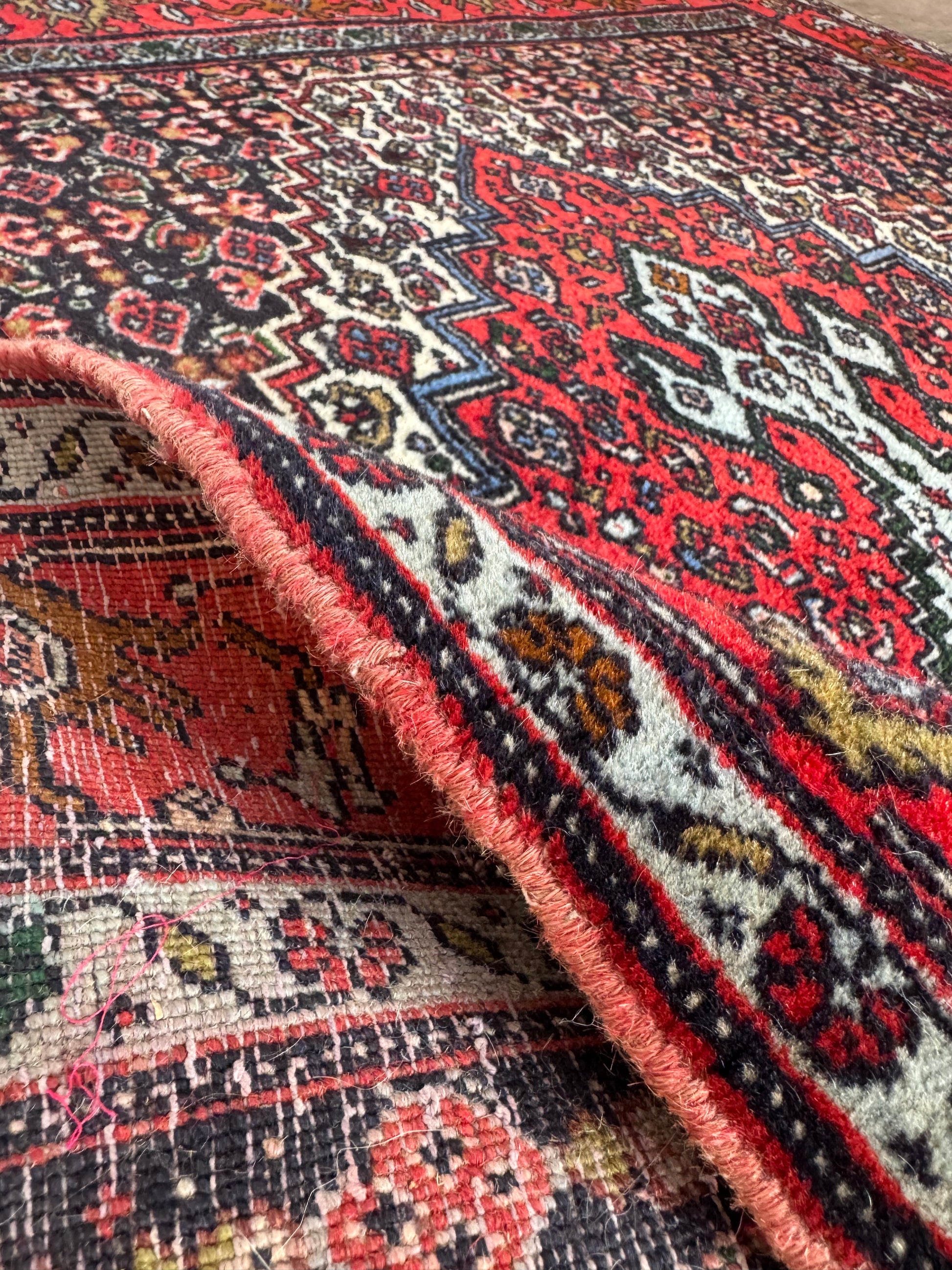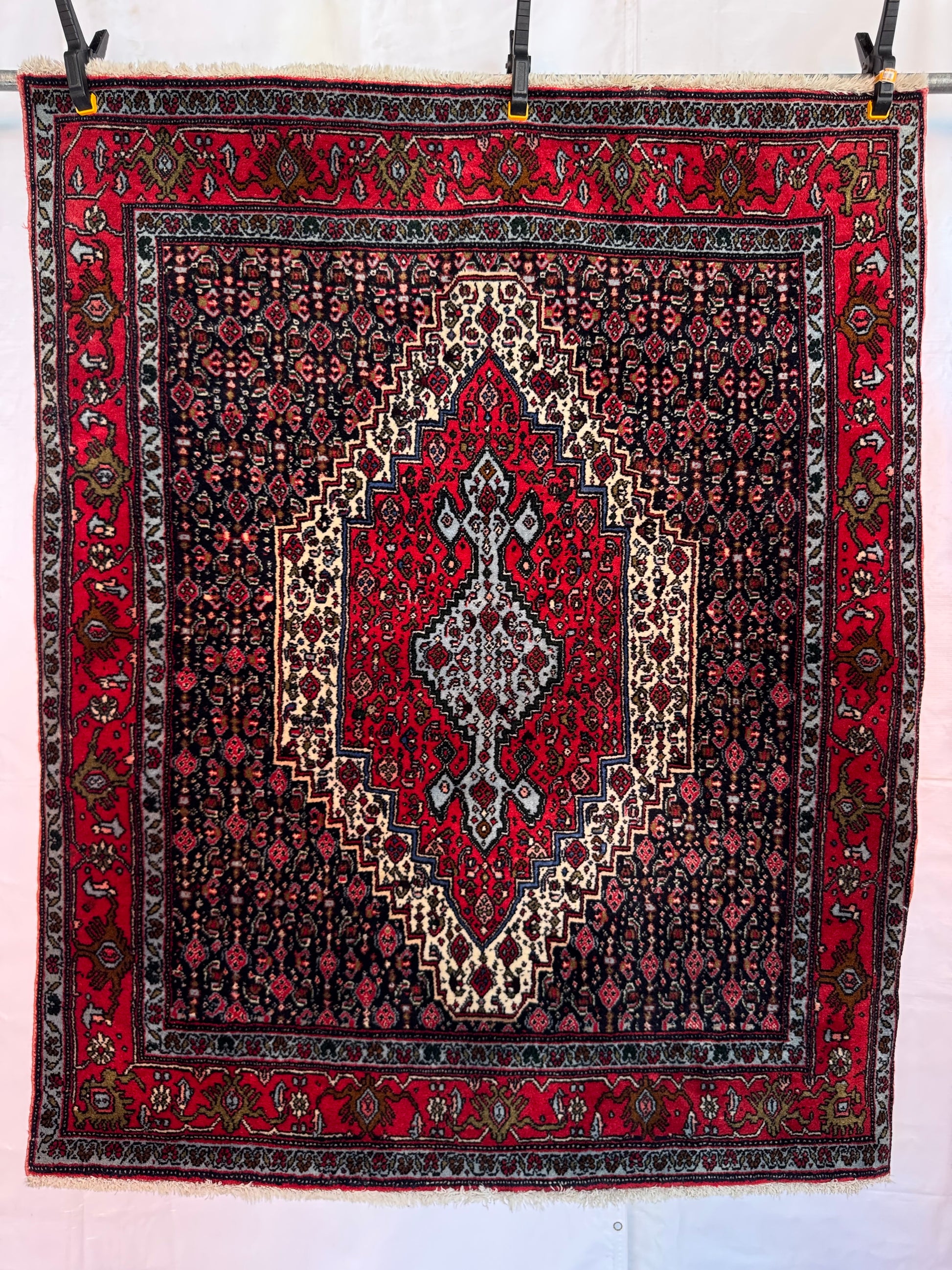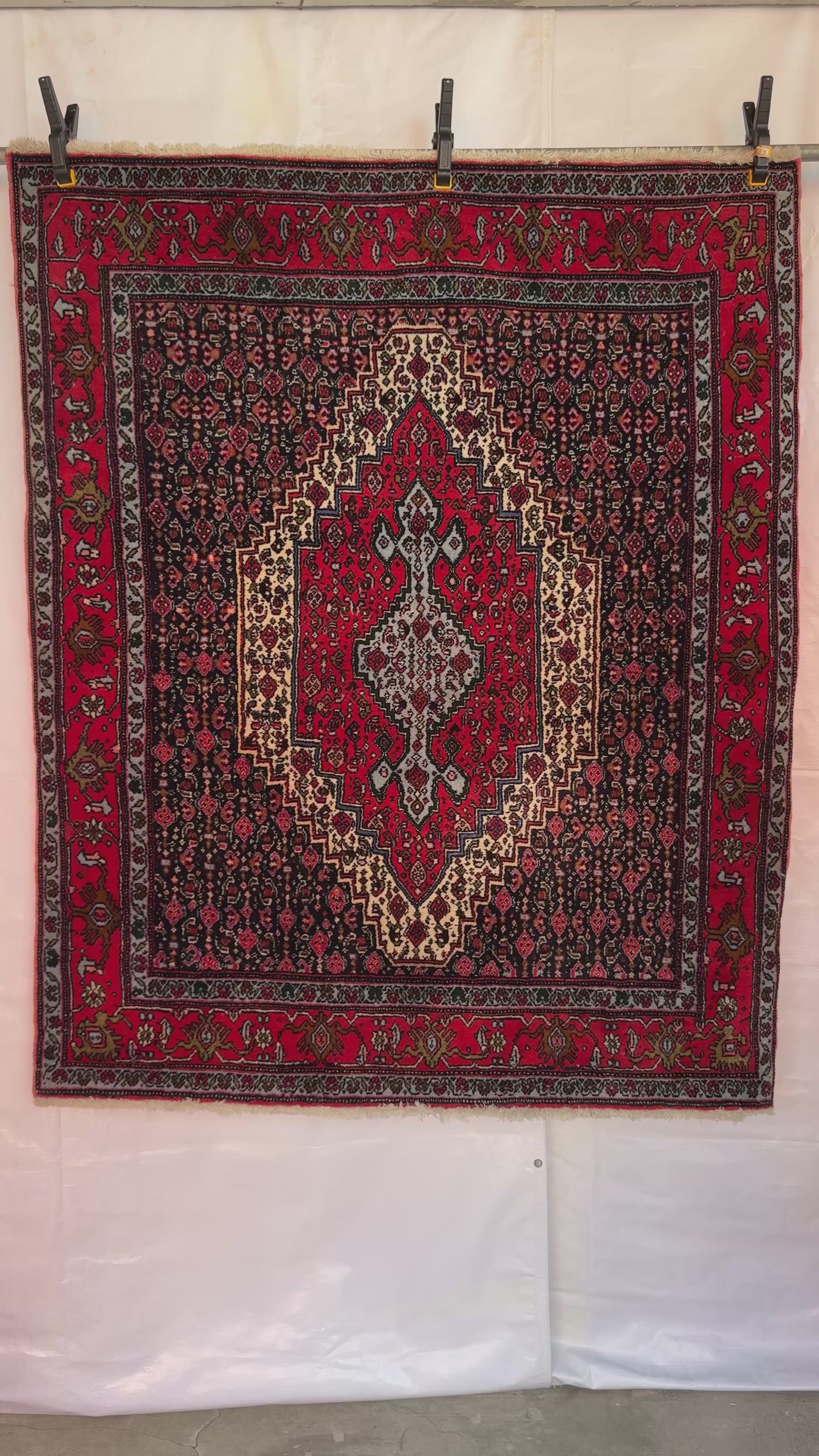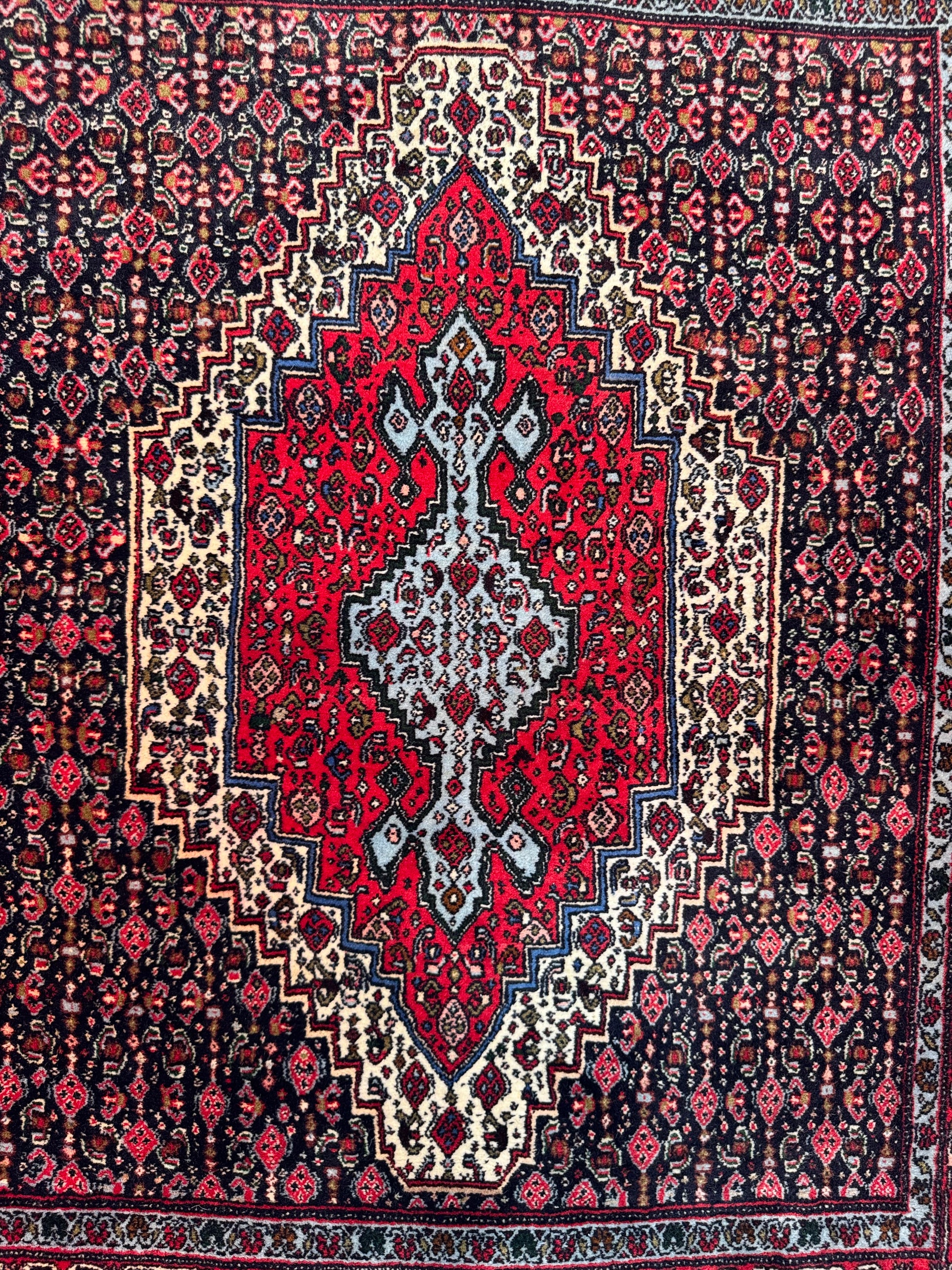 A vintage Senneh rug, handwoven in western Iran. Known for its fine weave and precise patterns, this piece features a striking stepped medallion surrounded by a densely packed floral field.