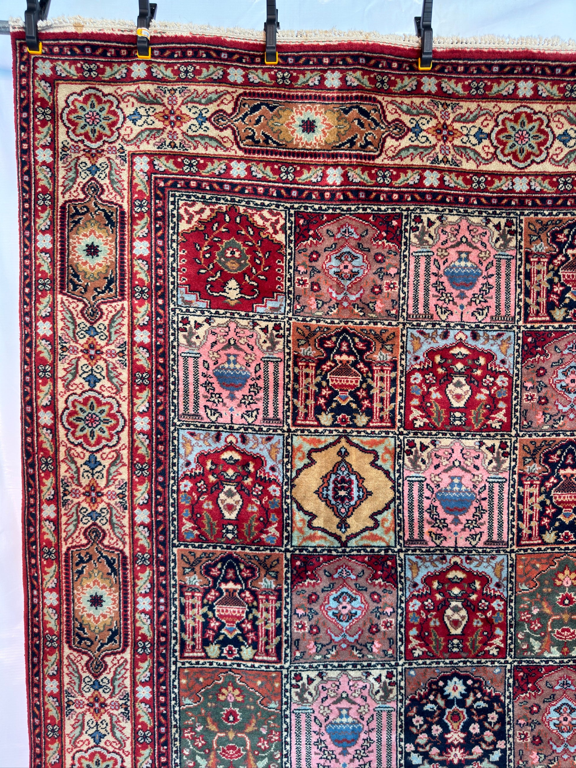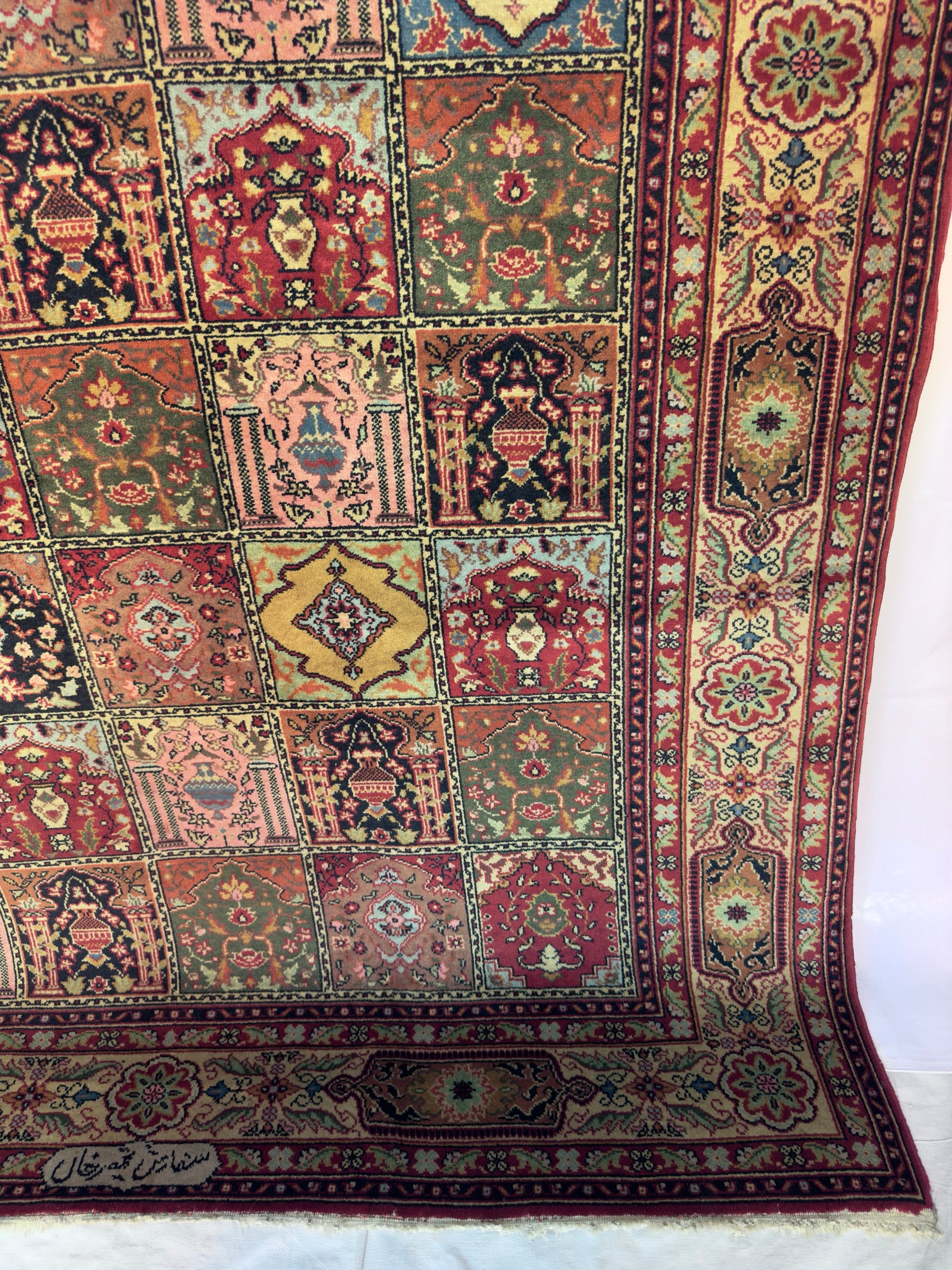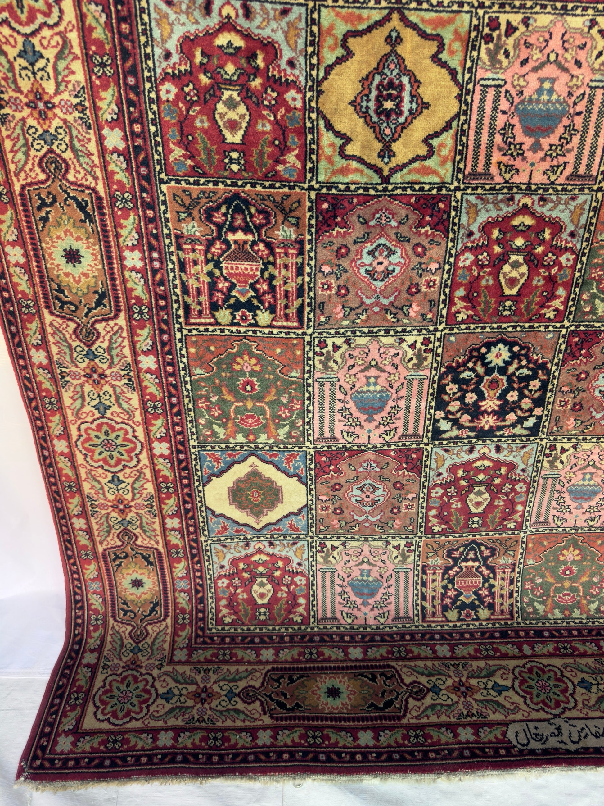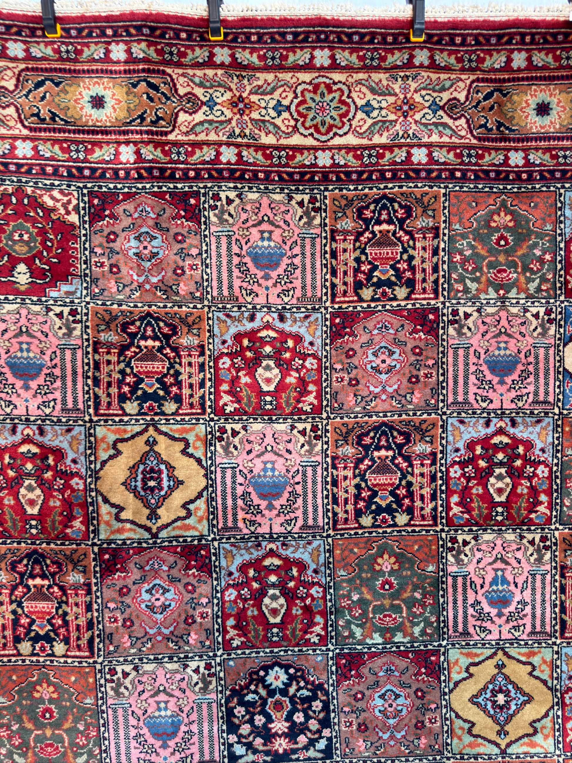 In good to very good vintage condition with minor age wears. Medium pile height from wool pile and cotton weft. Has a beautiful tiled or garden pane design - each box with an alternating floral motif.