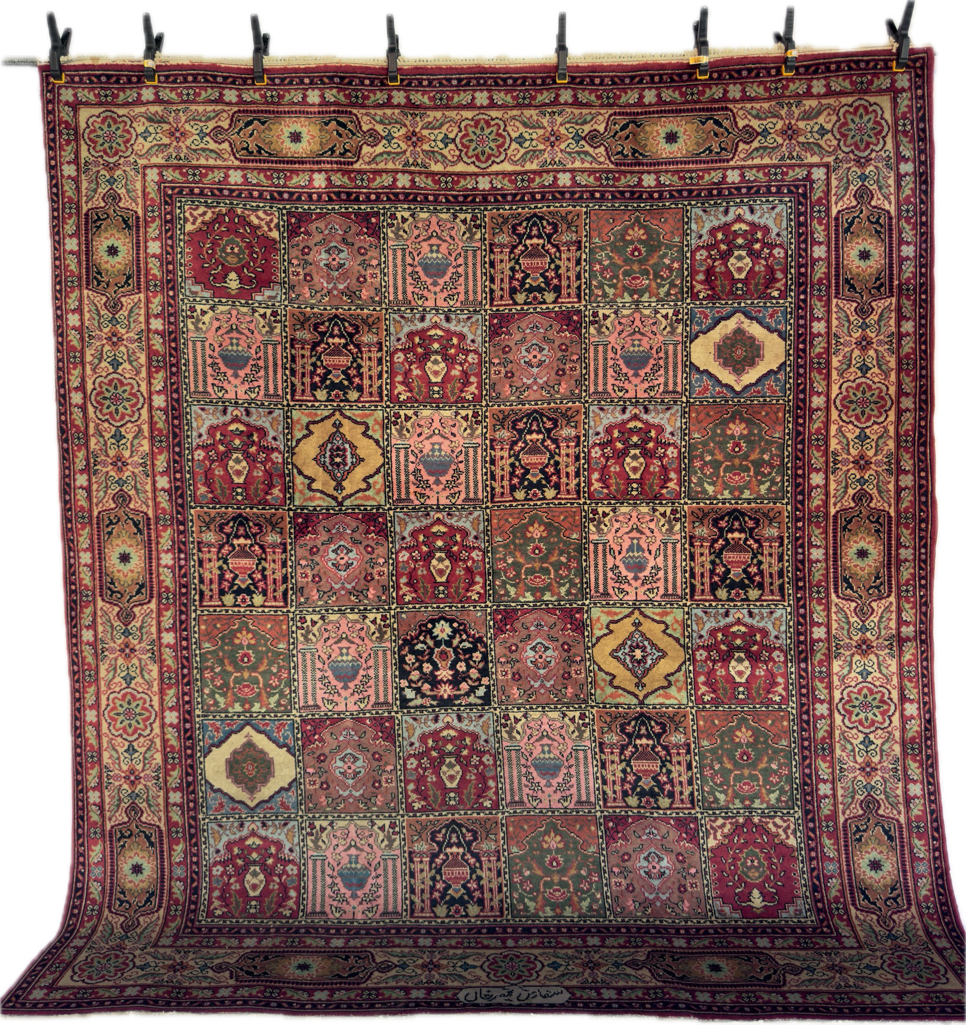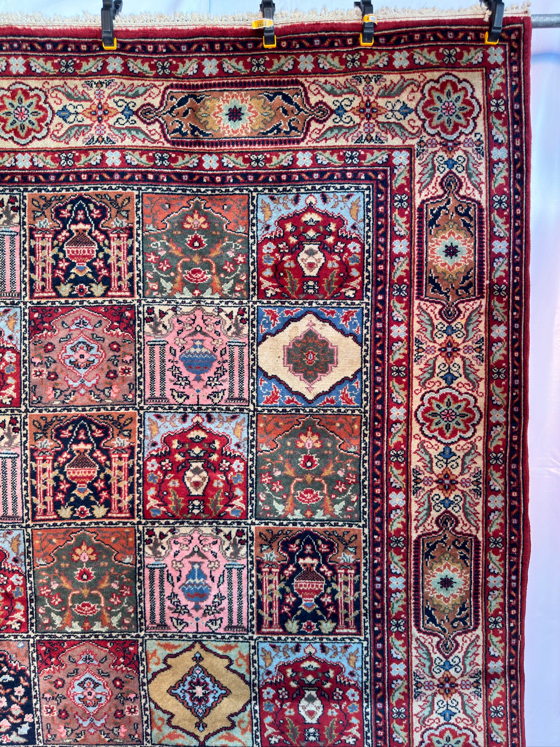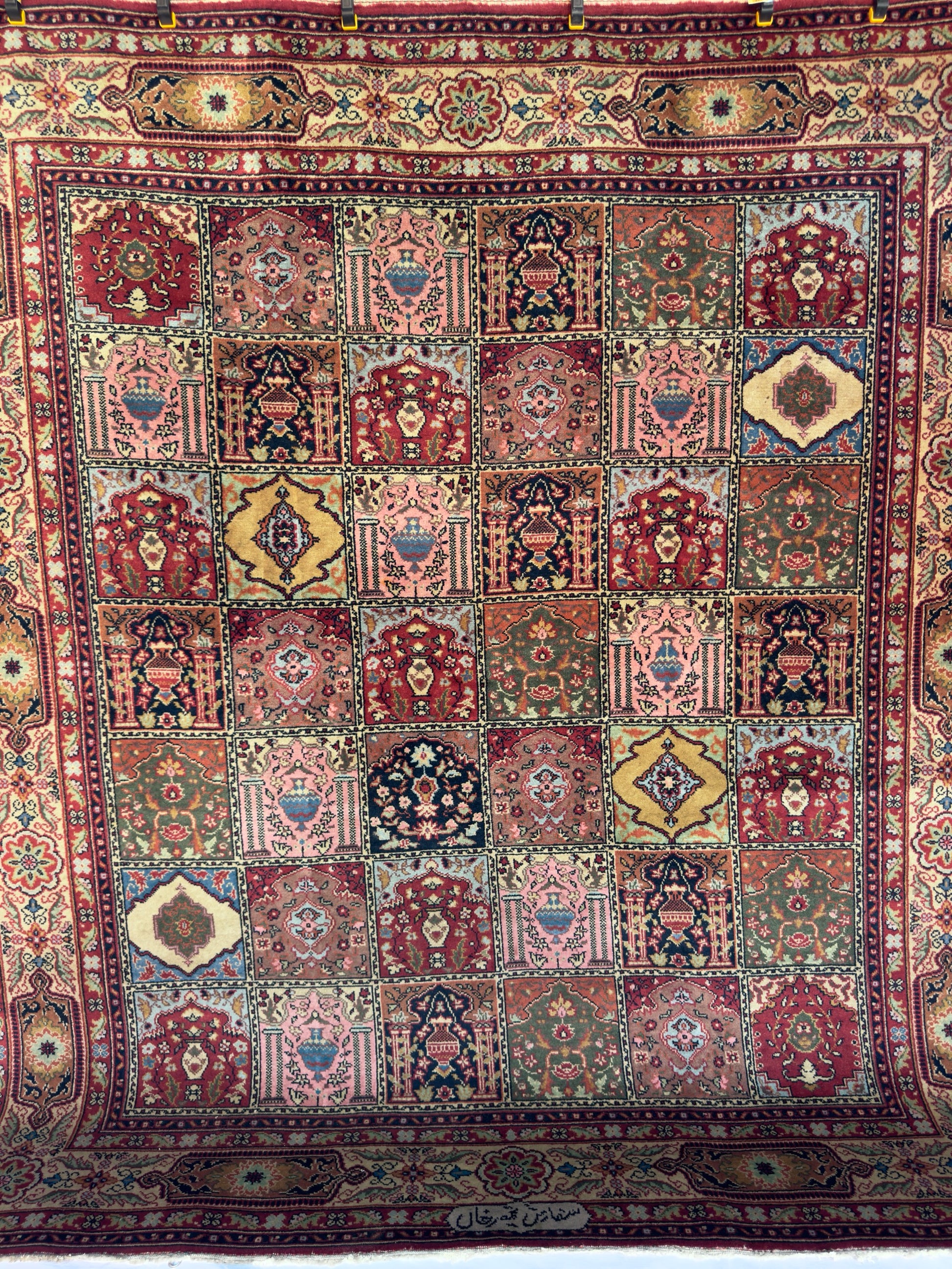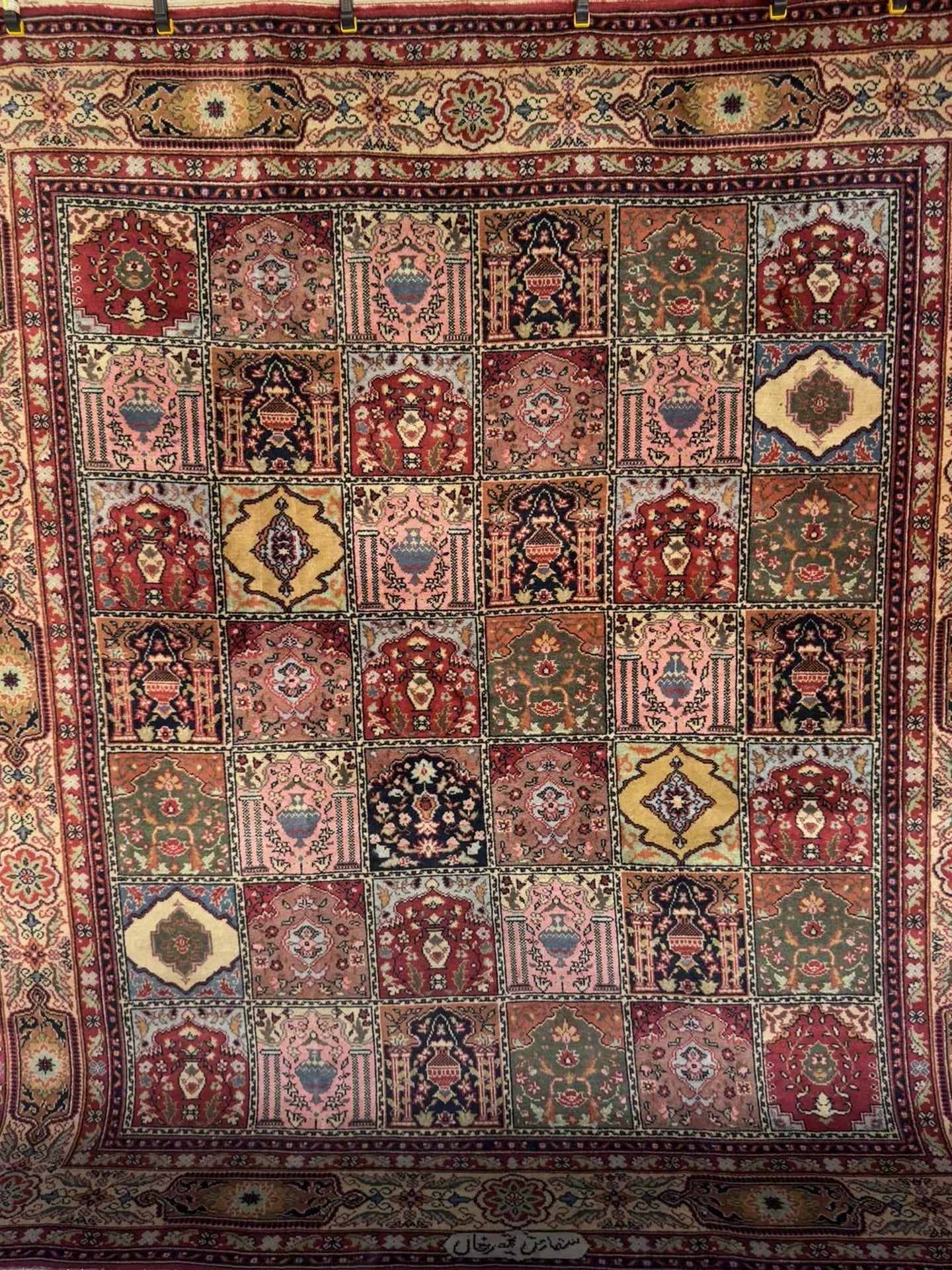 In good to very good vintage condition with minor age wears. Medium pile height from wool pile and cotton weft. Has a beautiful tiled or garden pane design - each box with an alternating floral motif.