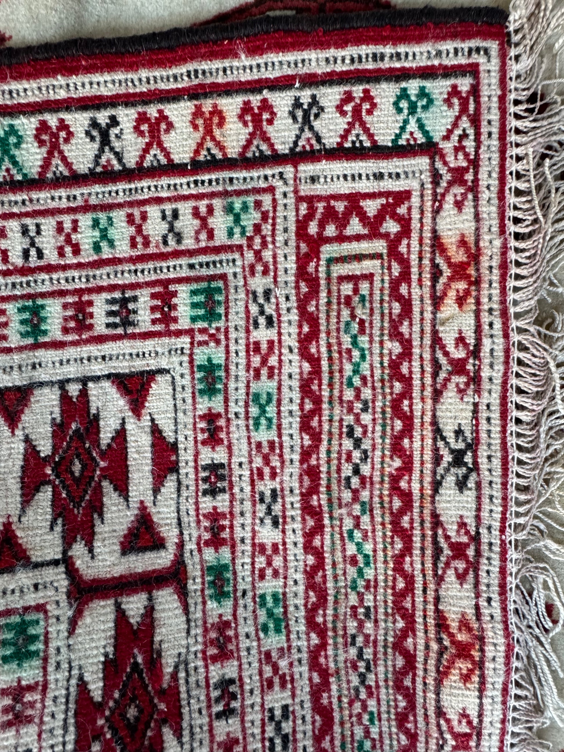 Timeless geometric gul motifs in deep burgundy, warm ivory, and earthy green — colors drawn from nature, meant to soften and glow with age.